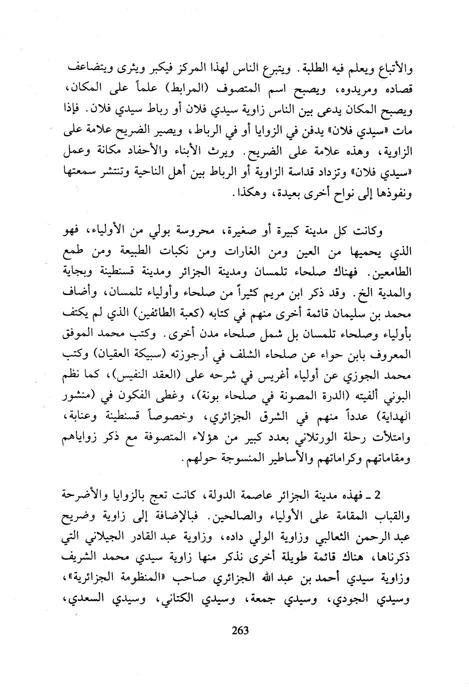 2 - فهذه مدينة الجزائر عاصمة الدولة، كانت تعج بالزوايا والأضرحة والقباب المقامة على الأولياء والصالحين. فبالإضافة إلى زاوية وضريح عبد الرحمن الثعالبي وزاوية الولي داده، وزاوية عبد القادر الجيلاني التي ذكرناها، هناك قائمة طويلة أخرى نذكر منها زاوية سيدي محمد الشريف وزاوية سيدي أحمد بن عبد الله الجزائري صاحب (المنظومة الجزائرية)، وسيدي الجودي، وسيدي جمعة، وسيدي الكتاني، وسيدي السعدي،