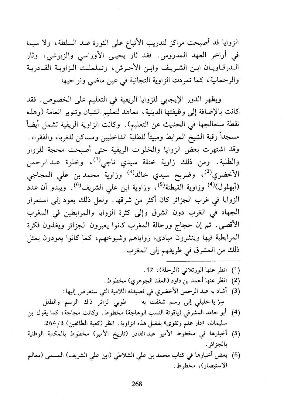 ويظهر الدور الإيجابي للزوايا الريفية في التعليم على الخصوص. فقد كانت بالإضافة إلى وظيفتها الدينية، معاهد لتعليم الشبان وتنوير العامة (وهذه نقطة سنعالجها في الحديث عن التعليم). وكانت الزاوية الريفية تشمل أيضا مسجدا وقبة الشيخ المرابط ومبيتا للطلبة الداخليين ومساكن للغرباء والفقراء. وقد اشتهرت بعض الزوايا والخلوات الريفية حتى أصبحت محجة للزوار والطلبة. ومن ذلك زاوية خنقة سيدي ناجي (¬1)، وخلوة عبد الرحمن الأخضري (¬2)، وضريح سيدي خالد (¬3) وزاوية محمد بن علي المجاجي (أبهلول) (¬4) وزاوية القيطنة (¬5)، وزاوية ابن علي الشريف (¬6). ويبدو أن عدد الزوايا في غرب الجزائر كان أكثر من شرقها. ولعل ذلك يعود إلى استمرار الجهاد في الغرب دون الشرق وإلى كثرة الزوايا والمرابطين في المغرب الأقصى. ثم إن حجاج ورحالة المغرب كانوا يعبرون الجزائر ويغذون فكرة المرابطية فيها وينشرون مبادئ زواياهم وشيوخهم، كما كانوا يعودون بمثل ذلك من المشرق في طريقهم إلى المغرب.