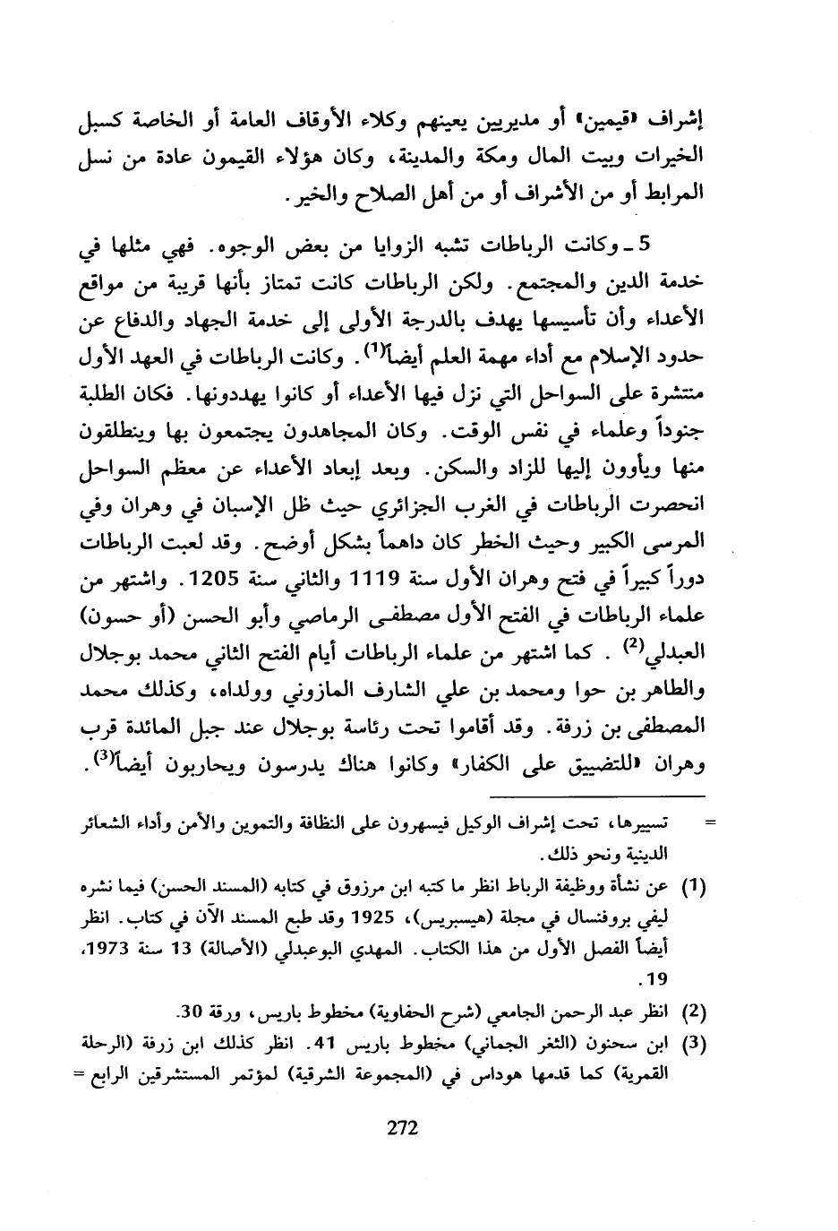 (¬1) عن نشأة ووظيفة الرباط انظر ما كتبه ابن مرزوق في كتابه (المسند الحسن) فيما نشره ليفي بروفنسال في مجلة (هيسبريس)، 1925 وقد طبع المسند الآن في كتاب. انظر أيضا الفصل الأول من هذا الكتاب. المهدي البوعبدلي (الأصالة) 13 سنة 1973، 19.