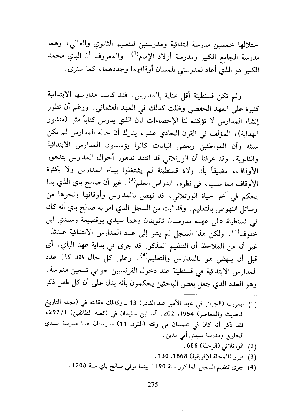 (¬1) ايمريت (الجزائر في عهد الأمير عبد القادر) 13 - وكذلك مقالته في (مجلة التاريخ الحديث والمعاصر) 1954، 202. أما ابن سليمان في (كعبة الطائفين) 1/ 292، فقد ذكر أنه كان في تلمسان في وقته (القرن 11) مدرستان هما مدرسة سيدي الحلوي ومدرسة سيدي أبي مدين.