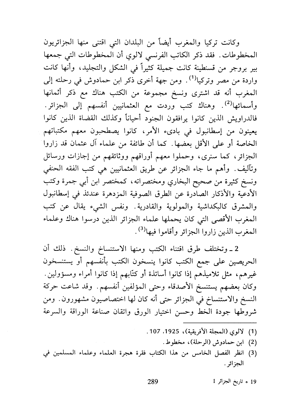 2 - وتختلف طرق اقتناء الكتب ومنها الاستنساخ والنسخ. ذلك أن الحريصين على جمع الكتب كانوا ينسخون الكتب بأنفسهم أو يستنسخون غيرهم، مثل تلاميذهم إذا كانوا أساتذة أو كتابهم إذا كانوا أمراء ومسؤولين. وكان بعضهم يستنسخ الأصدقاء وحتى المؤلفين أنفسهم. وقد شاعت حركة النسخ والاستنساخ في الجزائر حتى أنه كان لها اختصاصيون مشهورون. ومن شروطها جودة الخط وحسن اختيار الورق واتقان صناعة الوراقة والسرعة