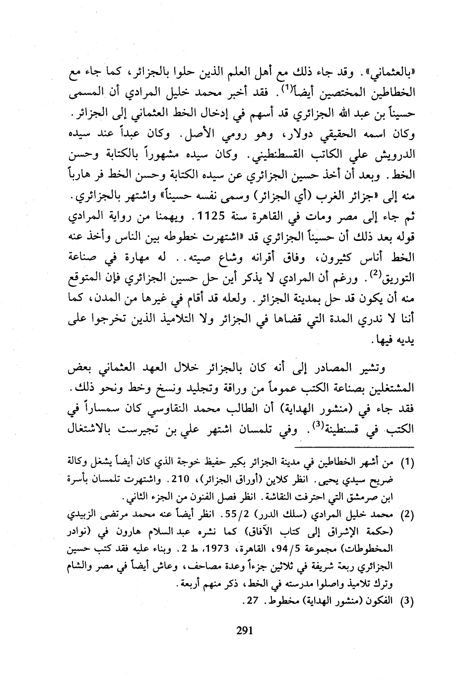 (¬1) من أشهر الخطاطين في مدينة الجزائر بكير حفيظ خوجة الذي كان أيضا يشغل وكالة ضريح سيدي يحيى. انظر كلاين (أوراق الجزائر)، 210. واشتهرت تلمسان بأسرة ابن صرمشق التي احترفت النقاشة. انظر فصل الفنون من الجزء الثاني.
