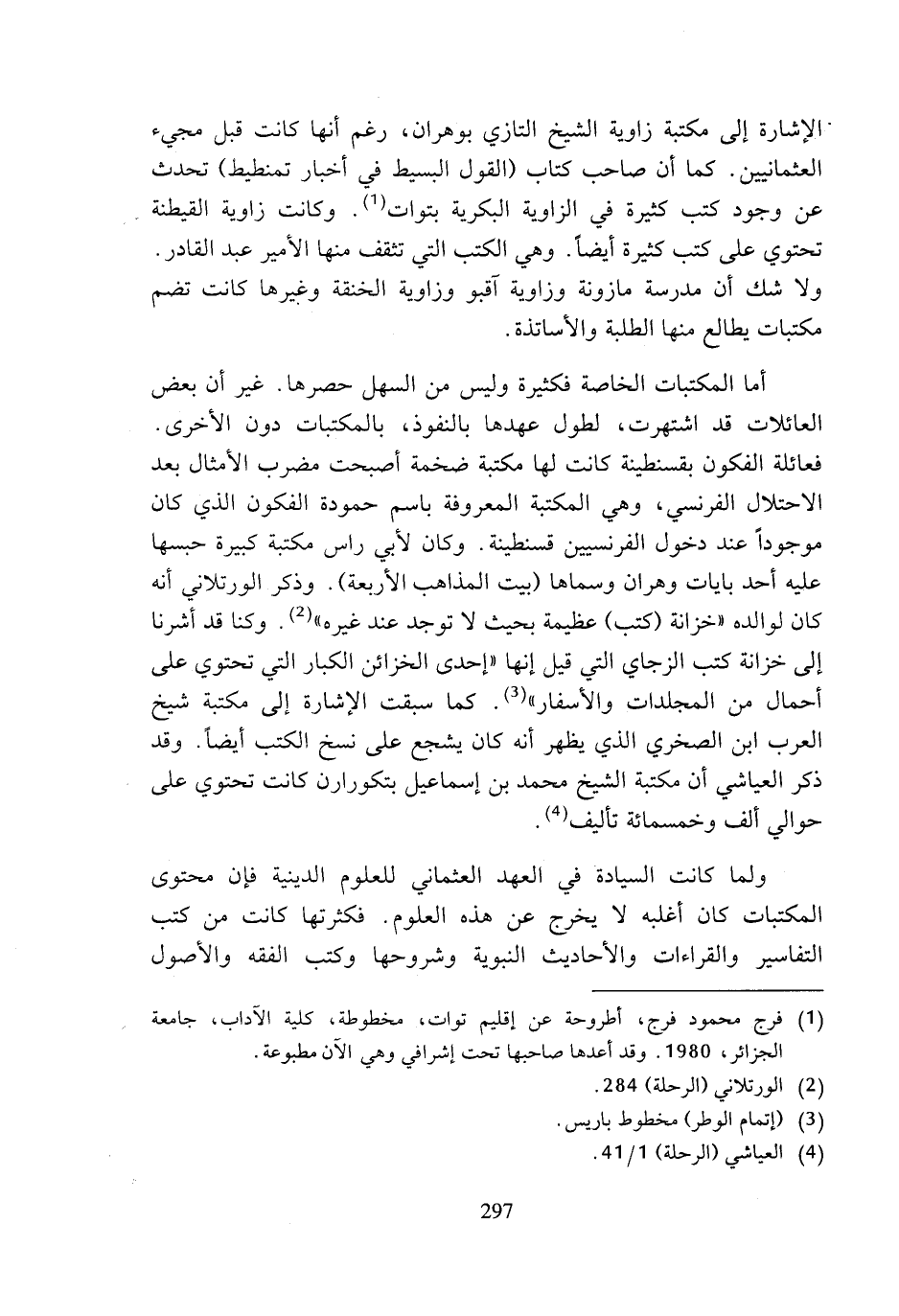الإشارة إلى مكتبة زاوية الشيخ التازي بوهران، رغم أنها كانت قبل مجيء العثمانيين. كما أن صاحب كتاب (القول البسيط في أخبار تمنطيط) تحدث عن وجود كتب كثيرة في الزاوية البسكرية بتوات (¬1). وكانت زاوية القيطنة تحتوي على كتب كثيرة أيضا. وهي الكتب التي تثقف منها الأمير عبد القادر. ولا شك أن مدرسة مازونة وزاوية آقبو وزاوية الخنقة وغيرها كانت تضم مكتبات يطالع منها الطلبة والأساتذة.