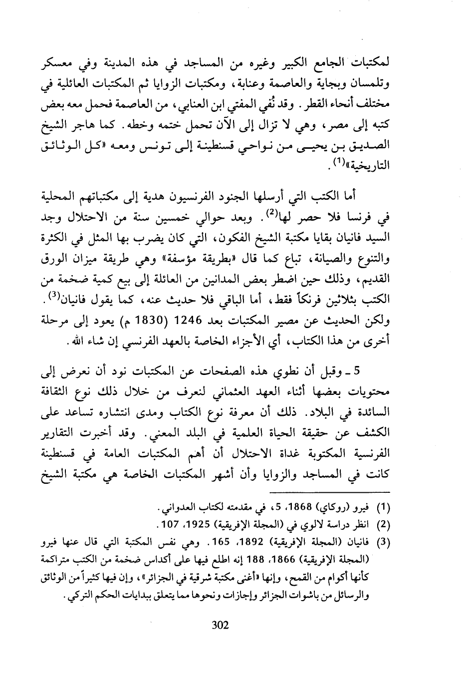 (¬3) فانيان (المجلة الإفريقية) 1892، 165. وهي نفس المكتبة التي قال عنها فيرو (المجلة الإفريقية) 1866، 188 إنه اطلع فيها على أكداس ضخمة من الكتب متراكمة كأنها أكوام من القمح، وإنها (أغنى مكتبة شرقية في الجزائر)، وإن فيها كثيرا من الوثائق والرسائل من باشوات الجزائر وإجازات ونحوها مما يتعلق ببدايات الحكم التركي.