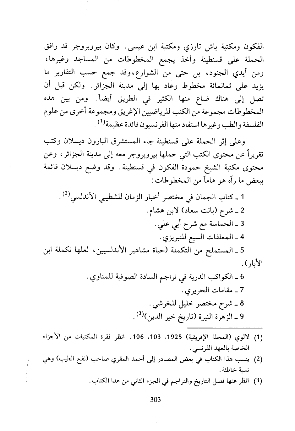 الفكون ومكتبة باش تارزي ومكتبة ابن عيسى. وكان بيروبروجر قد رافق الحملة على قسنطينة وأخذ يجمع المخطوطات من المساجد وغيرها، ومن أيدي الجنود، بل حتى من الشوارع، وقد جمع حسب التقارير ما يزيد على ثمانمائة مخطوط وعاد بها إلى مدينة الجزائر. ولكن قبل أن تصل إلى هناك ضاع منها الكثير في الطريق أيضا. ومن بين هذه المخطوطات مجموعة من الكتب للرياضيين الإغريق ومجموعة أخرى من علوم الفلسفة والطب وغيرها استفاد منها الفرنسيون فائدة عظيمة (¬1).