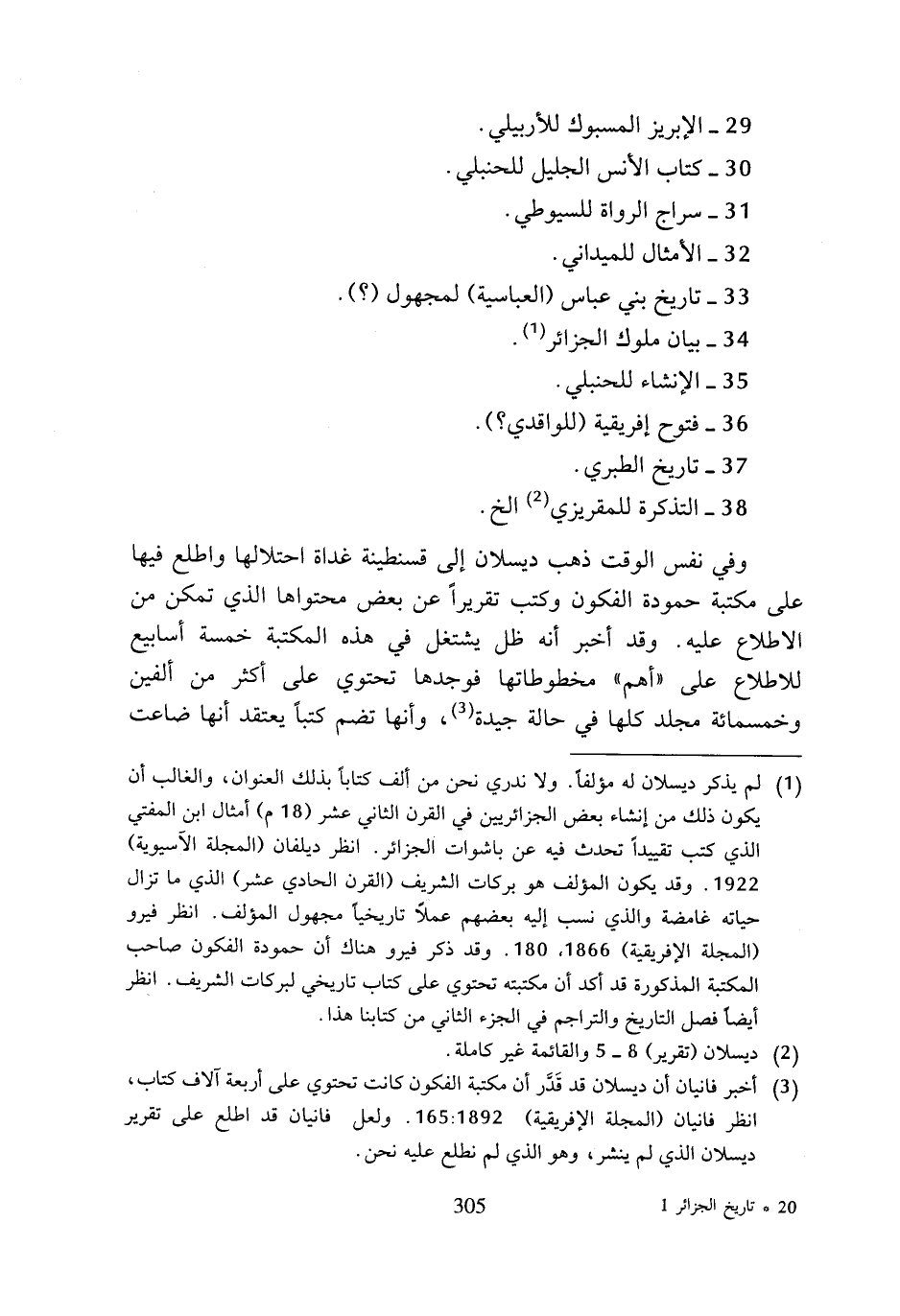 (¬3) أخبر فانيان أن ديسلان قد قدر أن مكتبة الفكون كانت تحتوي على أربعة آلاف كتاب، انظر فانيان (المجلة الإفريقية) 1892: 165. ولعل فانيان قد اطلع على تقرير ديسلان الذي لم ينشر، وهو الذي لم نطلع عليه نحن.