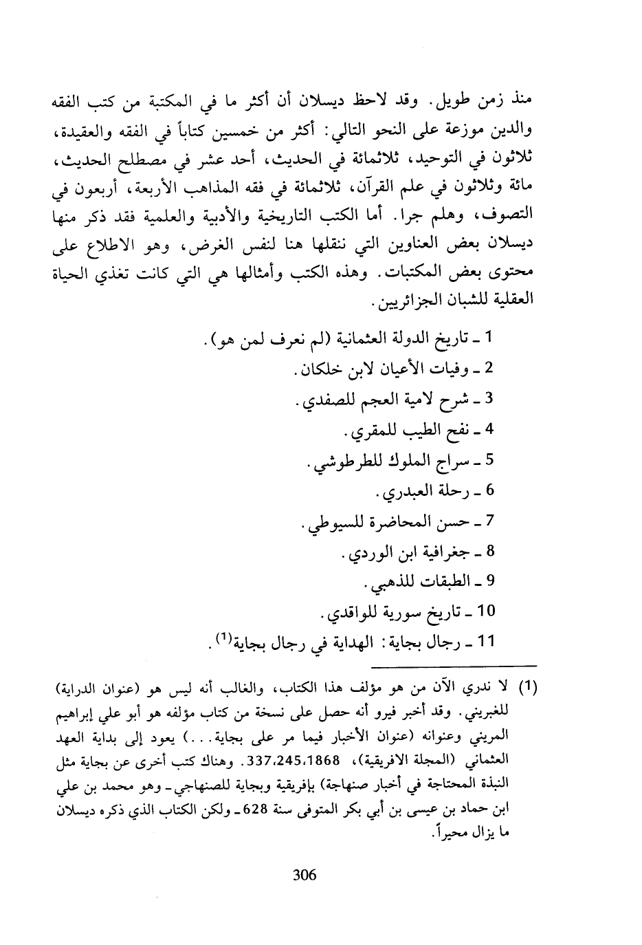 منذ زمن طويل. وقد لاحظ ديلان أن أكثر ما في المكتبة من كتب الفقه والدين موزعة على النحو التالي: أكثر من خمسين كتابا في الفقه والعقيدة، ثلاثون في التوحيد، ثلاثمائة في الحديث، أحد عشر في مصطلح الحديث، مائة وثلاثون في علم القرآن، ثلاثمائة في فقه المذاهب الأربعة، أربعون في التصوف، وهلم جرا. أما الكتب التاريخية والأدبية والعلمية فقد ذكر منها ديسلان بعض العناوين التي ننقلها هنا لنفس الغرض، وهو الاطلاع على محتوى بعض المكتبات. وهذه الكتب وأمثالها هي التي كانت تغذي الحياة العقلية للشبان الجزائريين.