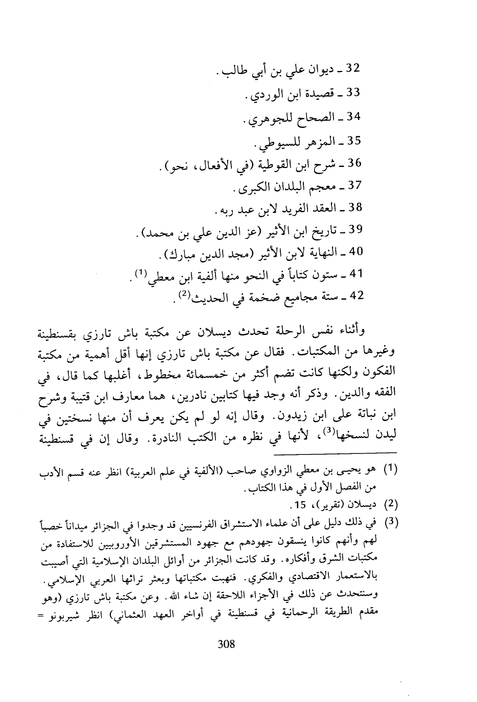 (¬3) في ذلك دليل على أن علماء الاستشراق الفرنسيين قد وجدوا في الجزائر ميدانا خصبا لهم وأنهم كانوا ينسقون جهودهم مع جهود المستشرقين الأوروبيين للاستفادة من مكتبات الشرق وأفكاره. وقد كانت الجزائر من أوائل البلدان الإسلامية التي أصيبت بالاستعمار الاقتصادي والفكري. فنهبت مكتباتها وبعثر تراثها العربي الإسلامي. وسنتحدث عن ذلك في الأجزاء اللاحقة إن شاء الله , وعن مكتبة باش تارزي (وهو مقدم الطريقة الرحمانية في قسنطينة في أواخر العهد العثماني) انظر شيربونو =