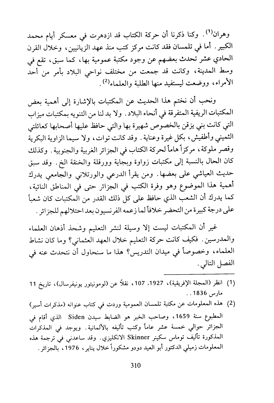 (¬2) هذه المعلومات عن مكتبة تلمسان العمومية وردت في كتاب عنوانه (مذكرات أسير) المطبوع سنة 1659، وصاحب الخبر هو الضابط سيدن Siden الذي أقام في الجزائر حوالي خمسة عشر عاما وكتب تأليفه بالألمانية, ويوجد في المذكرات المذكورة تأليف توماس سكينر Skinner الانكليزي. وقد ساعدني في ترجمة هذه المعلومات زميلي الدكتور أبو العيد دودو مشكورا خلال يناير، 1976، بالجزائر.