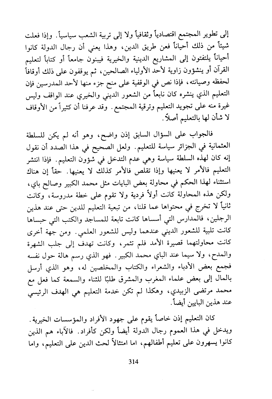إلى تطوير المجتمع اقتصاديا وثقافيا ولا إلى تربية الشعب سياسيا. وإذا فعلت شيئا من ذلك أحيانا فعن طريق الدين، وهذا يعني أن رجال الدولة كانوا أحيانا يلتفتون إلى المشاريع الدينية والخيرية فيبنون جامعا أو كتابا لتعليم القرآن أو ينشؤون زاوية لأحد الأولياء الصالحين، ثم يوقفون على ذلك أوقافا لحفظه وصيانته، فإذا نص في الوقفية على منح جزء منها لأحد المدرسين فإن التعليم الذي ينشره كان نابعا من الشعور الديني والخيري عند الواقف وليس غيرة منه على تجويد التعليم وترقية المجتمع. وقد عرفنا أن كثيرا من الأوقاف لا شأن لها بالتعليم أصلا.