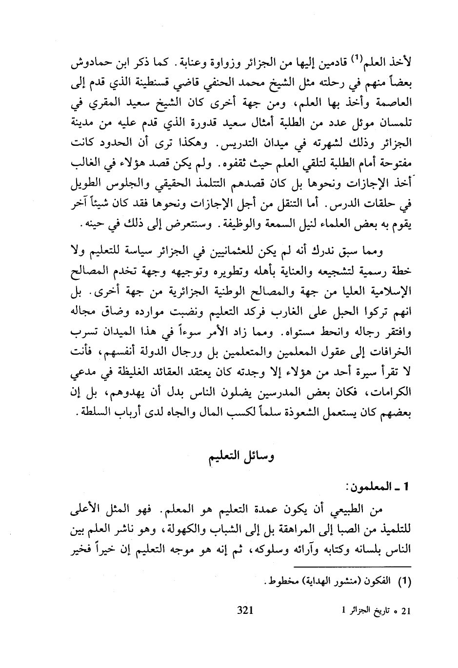 لأخذ العلم (¬1) قادمين إليها من الجزائر وزواوة وعنابة. كما ذكر ابن حمادوش بعضا منهم في رحلته مثل الشيخ محمد الحنفي قاضي قسنطينة الذي قدم إلى العاصمة وأخذ بها العلم, ومن جهة أخرى كان الشيخ سعيد المقري في تلمسان موئل عدد من الطلبة أمثال سعيد قدورة الذي قدم عليه من مدينة الجزائر وذلك لشهرته في ميدان التدريس. وهكذا ترى أن الحدود كانت مفتوحة أمام الطلبة لتلقي العلم حيث ثقفوه. ولم يكن قصد هؤلاء في الغالب أخذ الإجازات ونحوها بل كان قصدهم التتلمذ الحقيقي والجلوس الطويل في حلقات الدرس. أما التنقل من أجل الإجازات ونحوها فقد كان شيئا آخر يقوم به بعض العلماء لنيل السمعة والوظيفة. وسنتعرض إلى ذلك في حينه.