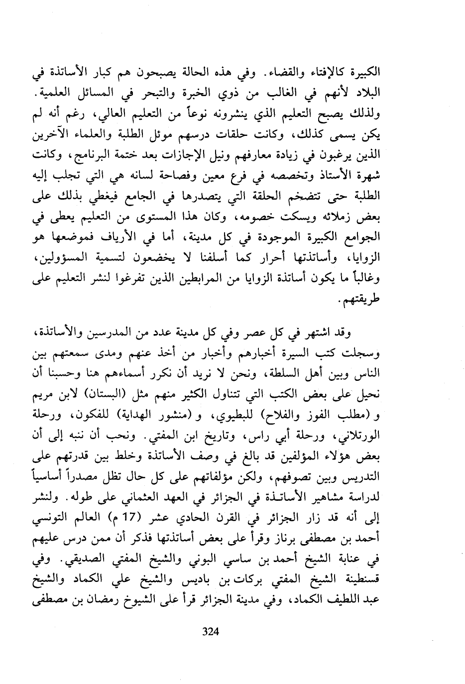 الكبيرة كالإفتاء والقضاء. وفي هذه الحالة يصبحون هم كبار الأساتذة في البلاد لأنهم في الغالب من ذوي الخبرة والتبحر في المسائل العلمية. ولذلك يصبح التعليم الذي ينشرونه نوعا من التعليم العالي، رغم أنه لم يكن يسمى كذلك، وكانت حلقات درسهم موئل الطلبة والعلماء الآخرين الذين يرغبون في زيادة معارفهم ونيل الإجازات بعد ختمة البرنامج، وكانت شهرة الأستاذ وتخصصه في فرع معين وفصاحة لسانه هي التي تجلب إليه الطلبة حتى تتضخم الحلقة التي يتصدرها في الجامع فيغطي بذلك على بعض زملائه ويسكت خصومه، وكان هذا المستوى من التعليم يعطى في الجوامع الكبيرة الموجودة في كل مدينة، أما في الأرياف فموضعها هو الزوايا، وأساتذتها أحرار كما أسلفنا لا يخضعون لتسمية المسؤولين، وغالبا ما يكون أساتذة الزوايا من المرابطين الذين تفرغوا لنشر التعليم على طريقتهم.