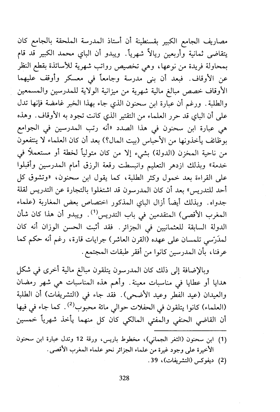 مصاريف الجامع الكبير بقسنطينة أن أستاذ المدرسة الملحقة بالجامع كان يتقاضى ثمانية وأربعين ريالا شهريا, ويبدو أن الباي محمد الكبير قد قام بمحاولة فريدة من نوعها، وهي تخصيص رواتب شهرية للأساتذة بقطع النظر عن الأوقاف. فبعد أن بنى مدرسة وجامعا في معسكر وأوقف عليهما الأوقاف خصص مبالغ مالية شهرية من ميزانية الولاية للمدرسين والمسمعين والطلبة. ورغم أن عبارة ابن سحنون الذي جاء بهذا الخبر غامضة فإنها تدل على أن الباي قد حرر العلماء من التقتير الذي كانت تجود به الأوقاف. وهذه هي عبارة ابن سحنون في هذا الصدد (أنه رتب المدرسين في الجوامع بوظائف يأخذونها من الأحباس (بيت المال؟) بعد أن كان العلماء لا ينتفعون من ناحية المخزن (الدولة) بشيء إلا من كان متوليا لخطة أو مستعملا في خدمة) وبذلك ازدهر التعليم وانبسطت رقعة الرزق أمام المدرسين وأقبلوا على القراءة بعد خمول وكثر الطلبة، كما يقول ابن سحنون، (وتشوق كل أحد للتدريس) بعد أن كان المدرسون قد اشتغلوا بالتجارة عن التدريس لقلة جدواه. وبذلك أيضا أزال الباي المذكور اختصاص بعض المغاربة (علماء المغرب الأقصى) المتقدمين في باب التدريس (¬1). ويبدو أن هذا كان شأن الدولة السابقة للعثمانيين في الجزائر. فقد أثبت الحسن الوزان أنه كان لمدرسي تلمسان على عهده (القرن العاشر) جرايات قارة، رغم أنه حكم كما عرفنا، بأن المدرسين كانوا من أفقر طبقات المجتمع.