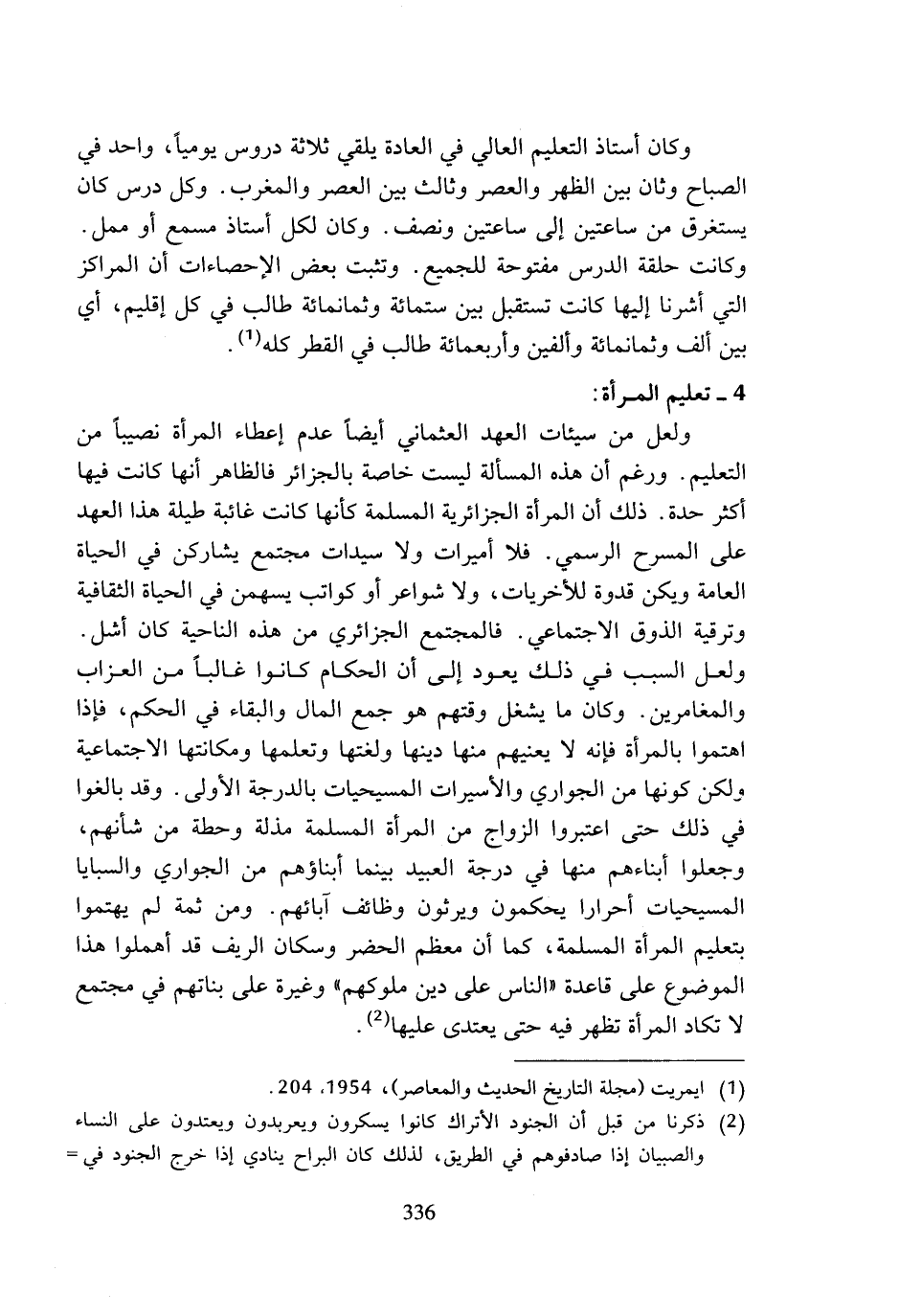 ولعل من سيئات العهد العثماني أيضا عدم إعطاء المرأة نصيبا من التعليم. ورغم أن هذه المسألة ليست خاصة بالجزائر فالظاهر أنها كانت فيها أكثر حدة. ذلك أن المرأة الجزائرية المسلمة كأنها كانت غائبة طيلة هذا العهد على المسرح الرسمي. فلا أميرات ولا سيدات مجتمع يشاركن في الحياة العامة ويكن قدوة للأخريات، ولا شواعر أو كواتب يسهمن في الحياة الثقافية وترقية الذوق الاجتماعي. فالمجتمع الجزائري من هذه الناحية كان أشل. ولعل السبب في ذلك يعود إلى أن الحكام كانوا غالبا من العزاب والمغامرين. وكان ما يشغل وقتهم هو جمع المال والبقاء في الحكم، فإذا اهتموا بالمرأة فإنه لا يعنيهم منها دينها ولغتها وتعلمها ومكانتها الاجتماعية ولكن كونها من الجواري والأسيرات المسيحيات بالدرجة الأولى. وقد بالغوا في ذلك حتى اعتبروا الزواج من المرأة المسلمة مذلة وحطة من شأنهم، وجعلوا أبناءهم منها في درجة العبيد بينما أبناؤهم من الجواري والبايا المسيحيات أحرارا يحكمون ويرثون وظائف آبائهم. ومن ثمة لم يهتموا بتعليم المرأة المسلمة، كما أن معظم الحضر وسكان الريف قد أهملوا هذا الموضوع على قاعدة (الناس على دين ملوكهم) وغيرة على بناتهم في مجتمع لا تكاد المرأة تظهر فيه حتى يعتدى عليه (¬2).