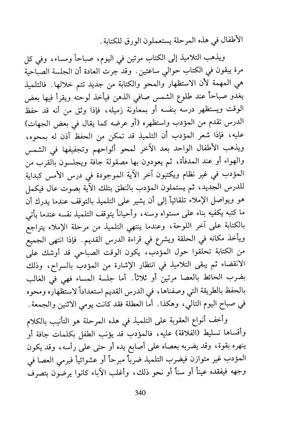 وأخف أنواع العقوبة على التلميذ في هذه المرحلة هو التأنيب بالكلام وأقساها تسليط (الفلاقة) عليه، فالمؤدب قد يؤنب الطفل بكلمات جافة أو ينهره بقوة، وقد يضربه بعصاه على أصابع يده أو حتى على رأسه، وقد يكون المؤدب غير متوازن فيضرب التلميذ ضربا مبرحا أو عشوائيا فيرمي العصا في وجهه فيفقده عينا أو سنا أو نحو ذلك، وأغلب الآباء كانوا يرضون بتصرف