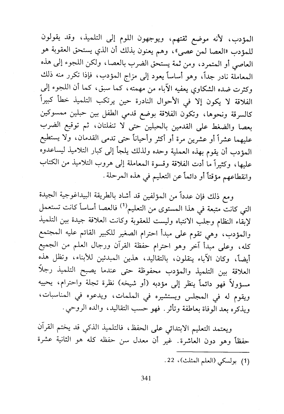 ومع ذلك فإن عددا من المؤلفين قد أشاد بالطريقة البيداغوجية الجيدة التي كانت متبعة في هذا المستوى من التعليم (¬1) فالعصا أساسا كانت تستعمل لإبقاء النظام وجلب الانتباه وليست للعقوبة وكانت العلاقة جيدة بين التلميذ والمؤدب، وهي تقوم على مبدأ احترام الصغير للكبير القائم عليه المجتمع كله، وعلى مبدأ آخر وهو احترام حفظة القرآن ورجال العلم من الجميع أيضا، وكان الآباء ينقلون، بالتقاليد، هذين المبدئين للأبناء، وتظل هذه العلاقة بين التلميذ والمؤدب محفوظة حتى عندما يصبح التلميذ رجلا مسؤولا فهو دائما ينظر إلى مؤدبه (أو شيخه) نظرة تجلة واحترام، يحييه ويقوم له في المجلس ويستشيره في الملمات، ويدعوه في المناسبات، ويذكره بعد الوفاة بعاطفة وتأثر. فهو حسب التقاليد، والده الروحي.