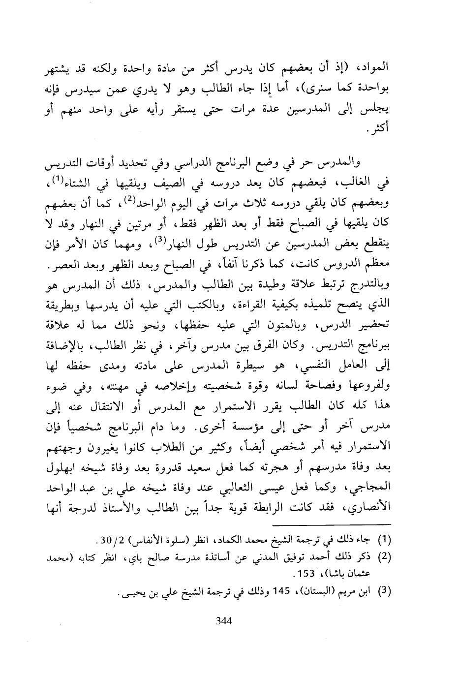 والمدرس حر في وضع البرنامج الدراسي وفي تحديد أوقات التدريس في الغالب، فبعضهم كان يعد دروسه في الصيف ويلقيها في الشتاء (¬1)، وبعضهم كان يلقي دروسه ثلاث مرات في اليوم الواحد (¬2)، كما أن بعضهم كان يلقيها في الصباح فقط أو بعد الظهر فقط، أو مرتين في النهار وقد لا ينقطع بعض المدرسين عن التدريس طول النهار (¬3)، ومهما كان الأمر فإن معظم الدروس كانت، كما ذكرنا آنفا، في الصباح وبعد الظهر وبعد العصر. وبالتدرج ترتبط علاقة وطيدة بين الطالب والمدرس، ذلك أن المدرس هو الذي ينصح تلميذه بكيفية القراءة، وبالكتب التي عليه أن يدرسها وبطريقة تحضير الدرس، وبالمتون التي عليه حفظها، ونحو ذلك مما له علاقة ببرنامج التدريس. وكان الفرق بين مدرس وآخر، في نظر الطالب، بالإضافة إلى العامل النفسي، هو سيطرة المدرس على مادته ومدى حفظه لها ولفروعها وفصاحة لسانه وقوة شخصيته وإخلاصه في مهنته، وفي ضوء هذا كله كان الطالب يقرر الاستمرار مع المدرس أو الانتقال عنه إلى مدرس آخر أو حتى إلى مؤسسة أخرى. وما دام البرنامج شخصيا فإن الاستمرار فيه أمر شخصي أيضا، وكثير من الطلاب كانوا يغيرون وجهتهم بعد وفاة مدرسهم أو هجرته كما فعل سعيد قدروة بعد وفاة شيخه ابهلول المجاجي، وكما فعل عيسى الثعالبي عند وفاة شيخه علي بن عبد الواحد الأنصاري، فقد كانت الرابطة قوية جدا بين الطالب والأستاذ لدرجة أنها