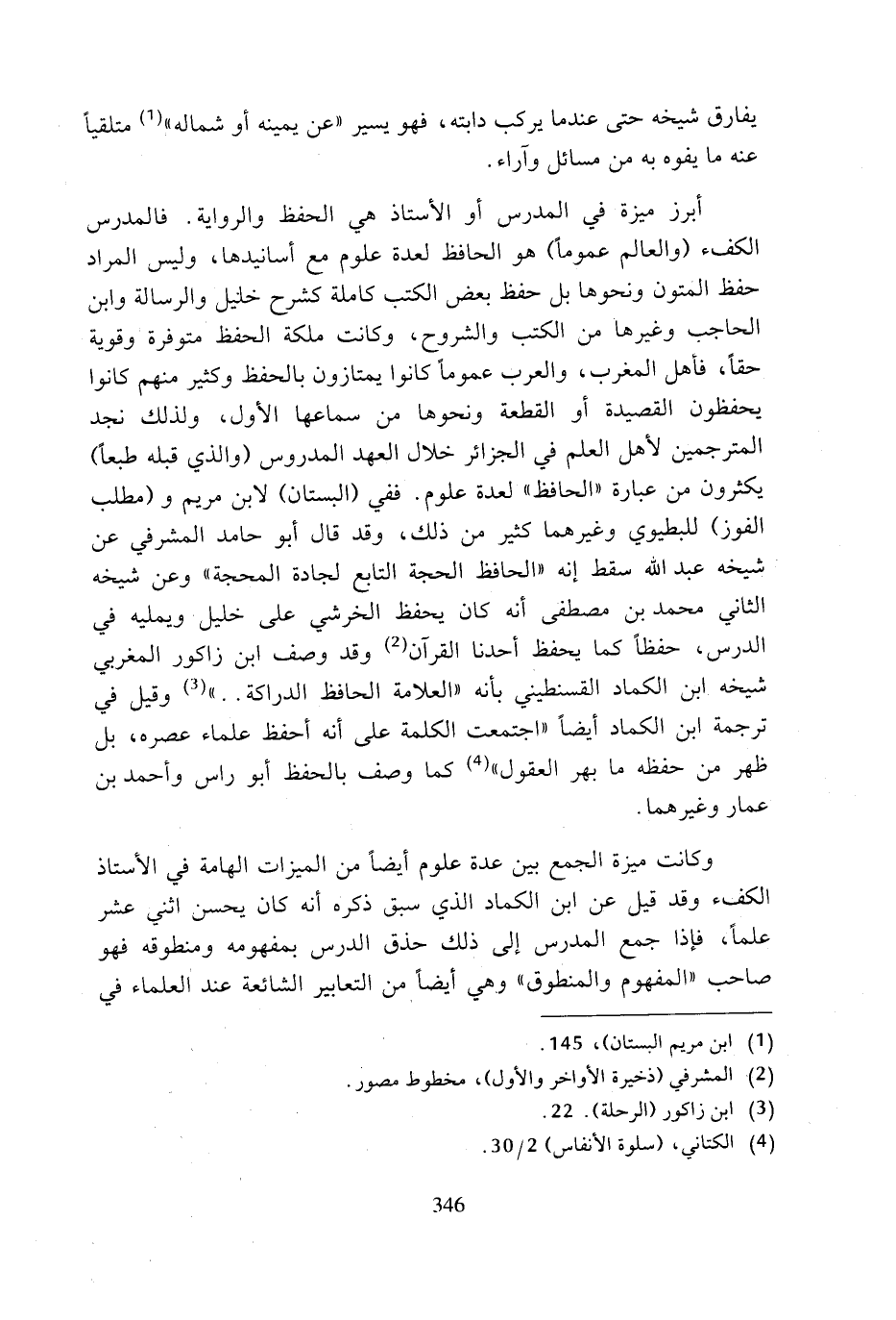 أبرز ميزة في المدرس أو الأستاذ هي الحفظ والرواية. فالمدرس الكفء (والعالم عموما) هو الحافظ لعدة علوم مع أسانيدها، وليس المراد حفظ المتون ونحوها بل حفظ بعض الكتب كاملة كشرح خليل والرسالة وابن الحاجب وغيرها من الكتب والشروح، وكانت ملكة الحفظ متوفرة وقوية حقا، فأهل المغرب، والعرب عموما كانوا يمتازون بالحفظ وكثير منهم كانوا يحفظون القصيدة أو القطعة ونحوها من سماعها الأول، ولذلك نجد المترجمين لأهل العلم في الجزائر خلال العهد المدروس (والذي قبله طبعا) يكثرون من عبارة (الحافظ) لعدة علوم. ففي (البستان) لابن مريم و (مطلب الفوز) للبطيوي وغيرهما كثير من ذلك، وقد قال أبو حامد المشرفي عن شيخه عبد الله سقط إنه (الحافظ الحجة التابع لجادة المحجة) وعن شيخه الثاني محمد بن مصطفى أنه كان يحفظ الخرشي على خليل ويمليه في الدرس، حفظا كما يحفظ أحدنا القرآن (¬2) وقد وصف ابن زاكور المغربي شيخه ابن الكماد القسنطيني بأنه (العلامة الحافظ الدراكة ..) (¬3) وقيل في ترجمة ابن الكماد أيضا (اجتمعت الكلمة على أنه أحفظ علماء عصره، بل ظهر من حفظه ما بهر العقول) (¬4) كما وصف بالحفظ أبو راس وأحمد بن عمار وغيرهما.