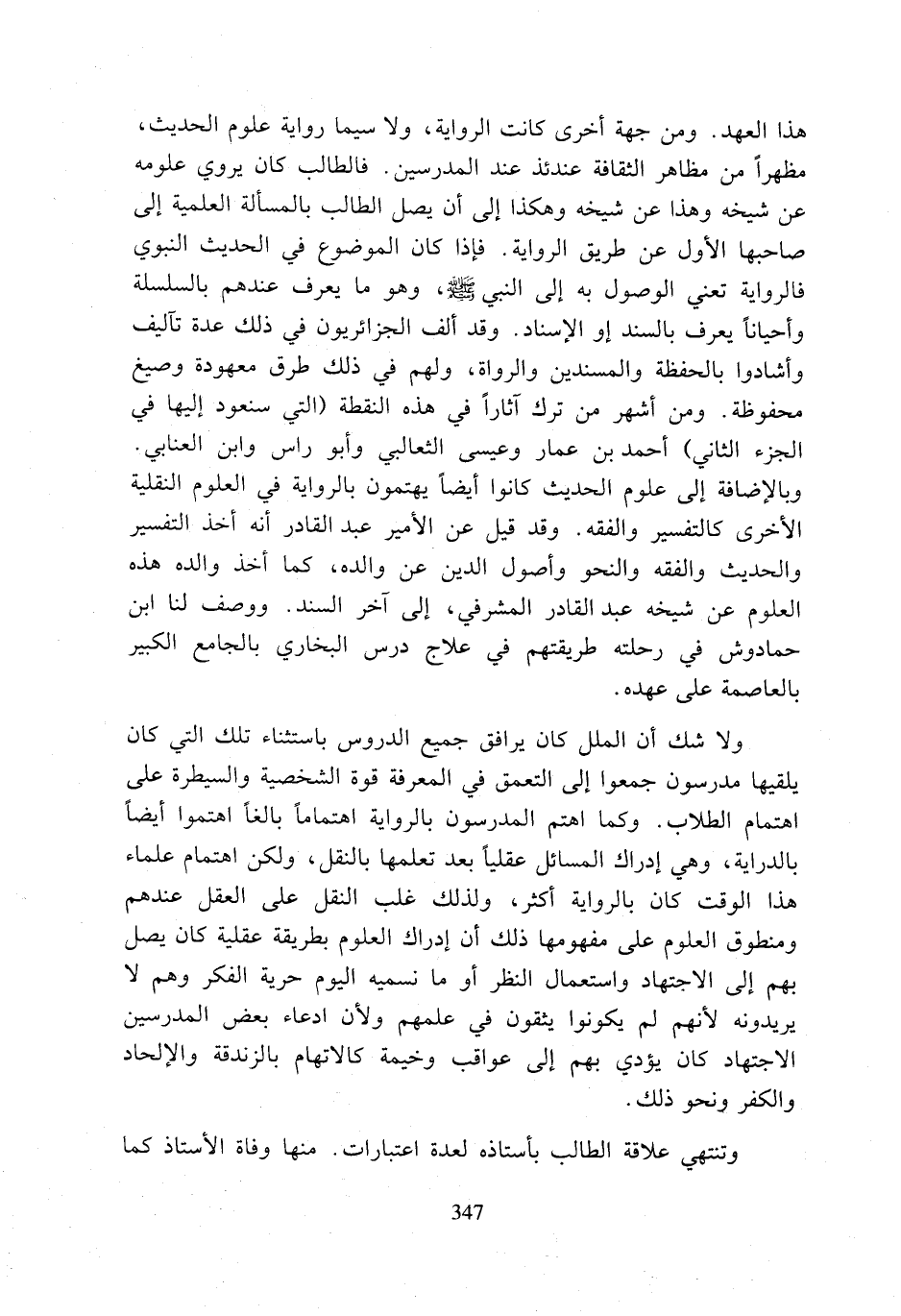 هذا العهد. ومن جهة أخرى كانت الرواية، ولا سيما رواية علوم الحديث، مظهرا من مظاهر الثقافة عندئذ عند المدرسين. فالطالب كان يروي علومه عن شيخه وهذا عن شيخه وهكذا إلى أن يصل الطالب بالمسألة العلمية إلى صاحبها الأول عن طريق الرواية. فإذا كان الموضوع في الحديث النبوي فالرواية تعني الوصول به إلى النبي (صلى الله عليه وسلم)، وهو ما يعرف عندهم بالسلسلة وأحيانا يعرف بالسند أو الإسناد. وقد ألف الجزائريون في ذلك عدة تآليف وأشادوا بالحفظة والمسندين والرواة، ولهم في ذلك طرق معهودة وصيغ محفوظة. ومن أشهر من ترك آثارا في هذه النقطة (التي سنعود إليها في الجزء الثاني) أحمد بن عمار وعيسى الثعالبي وأبو راس وابن العنابي.