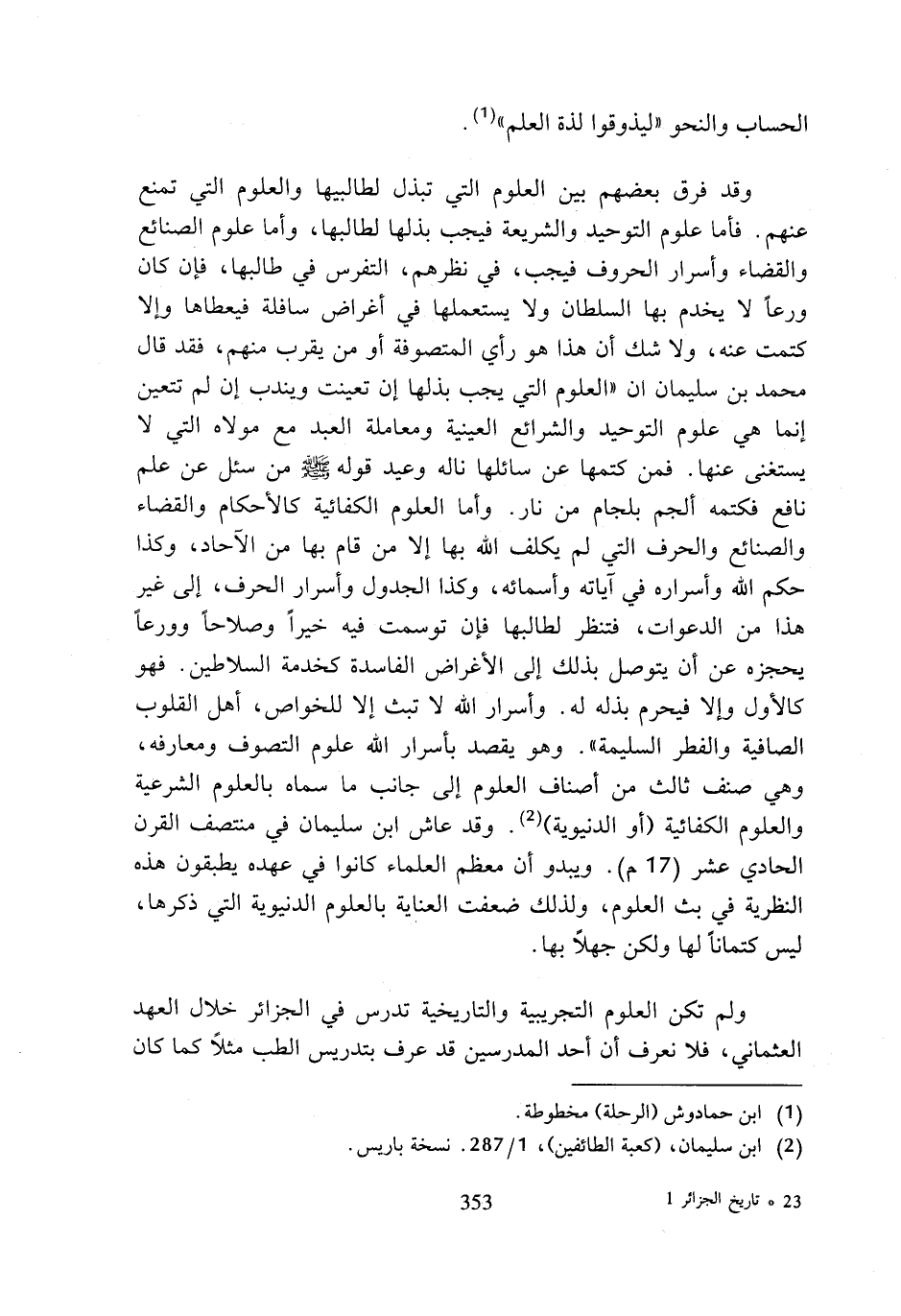 وقد فرق بعضهم بين العلوم التي تبذل لطالبيها والعلوم التي تمنع عنهم. فأما علوم التوحيد والشريعة فيجب بذلها لطالبها، وأما علوم الصنائع والقضاء وأسرار الحروف فيجب، في نظرهم، التفرس في طالبها، فإن كان ورعا لا يخدم بها السلطان ولا يتعملها في أغراض سافلة فيعطاها وإلا كتمت عنه، ولا شك أن هذا هو رأي المتصوفة أو من يقرب منهم، فقد قال محمد بن سليمان ان (العلوم التي يجب بذلها إن تعينت ويندب إن لم تتعين إنما هي علوم التوحيد والشرائع العينية ومعاملة العبد مع مولاه التي لا يستغنى عنها. فمن كتمها عن سائلها ناله وعيد قوله (صلى الله عليه وسلم) من سئل عن علم نافع فكتمه ألجم بلجام من نار. وأما العلوم الكفائية كالأحكام والقضاء والصنائع والحرف التي لم يكلف الله بها إلا من قام بها من الآحاد، وكذا حكم الله وأسراره في آياته وأسمائه، وكذا الجدول وأسرار الحرف، إلى غير هذا من الدعوات، فتنظر لطالبها فإن توسمت فيه خيرا وصلاحا وورعا يحجزه عن أن يتوصل بذلك إلى الأغراض الفاسدة كخدمة السلاطين. فهو كالأول وإلا فيحرم بذله له. وأسرار الله لا تبث إلا للخواص، أهل القلوب الصافية والفطر (السليمة). وهو يقصد بأسرار الله علوم التصوف ومعارفه، وهي صنف ثالث من أصناف العلوم إلى جانب ما سماه بالعلوم الشرعية والعلوم الكفائية (أو الدنيوية) (¬2). وقد عاش ابن سليمان في منتصف القرن الحادي عشر (17 م). ويبدو أن معظم العلماء كانوا في عهده يطبقون هذه النظرية في بث العلوم، ولذلك ضعفت العناية بالعلوم الدنيوية التي ذكرها، ليس كتمانا لها ولكن جهلا بها.