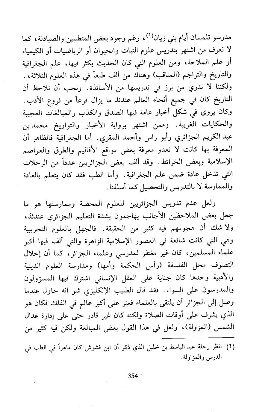 مدرسو تلمسان أيام بني زيان (¬1)، رغم وجود بعض المتطببين والصيادلة، كما لا نعرف من اشتهر بتدريس علوم النبات والحيوان أو الرياضيات أو الكيمياء أو علم الملاحة، ومن العلوم التي كان الحديث يكثر فيها، علم الجغرافية والتاريخ والتراجم (المناقب) وهناك من ألف طبعا في هذه العلوم الثلاثة، ولكننا لا ندري من برز في تدريسها من الأساتذة. ونحب أن نلاحظ أن التاريخ كان في جميع أنحاء العالم عندئذ ما يزال فرعا من فروع الأدب. وكان يروى في شكل أخبار عامة فيها الصدق والكذب والمبالغات العجيبة والحكايات الغريبة. وممن اشتهر برواية الأخبار والتواريخ محمد بن عبد الكريم الجزائري وأبو راس وأحمد المقري. أما الجغرافية فالظاهر أن المعرفة بها كانت لا تعدو معرفة بعض مواقع الأقاليم والطرق والعواصم الإسلامية وبعض الخرائط. وقد ألف بعض الجزائريين عددا من الرحلات التي تدخل عادة ضمن علم الجغرافية. وأما الطب فقد كان يتعلم بالعادة والممارسة لا بالتدريس والتحصيل كما أسلفنا.