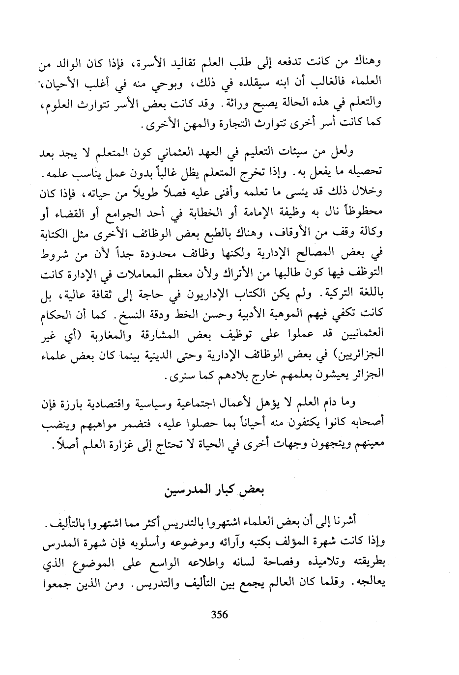 وما دام العلم لا يؤهل لأعمال اجتماعية وسياسية واقتصادية بارزة فإن أصحابه كانوا يكتفون منه أحيانا بما حصلوا عليه، فتضمر مواهبهم وينضب معينهم ويتجهون وجهات أخرى في الحياة لا تحتاج إلى غزارة العلم أصلا.
