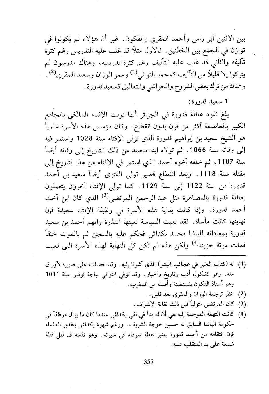 بلغ نفود عائلة قدورة في الجزائر أنها تولت الإفتاء المالكي بالجامع الكبير بالعاصمة أكثر من قرن بدون انقطاع. وكان مؤسس هذه الأسرة علميا هو الشيخ سعيد بن إبراهيم قدورة الذي تولى الإفتاء سنة 1028 واستمر فيه إلى وفاته سنة 1066. ثم تولاه ابنه محمد من ذلك التاريخ إلى وفاته أيضا سنة 1107، ثم خلفه أخوه أحمد الذي استمر في الإفتاء من هذا التاريخ إلى مقتله سنة 1118. وبعد انقطاع قصير تولى الفتوى أيضا سعيد بن أحمد قدورة من سنة 1122 إلى سنة 1129. كما تولى الإفتاء آخرون يتصلون بعائلة قدورة بالمصاهرة مثل عبد الرحمن المرتضى (¬3) الذي كان ابن أخت أحمد قدورة. وإذا كانت بداية هذه الأسرة في وظيفة الإفتاء سعيدة فإن نهايتها كانت مأساة. فقد لعبت السياسة لعبتها القذرة واتهم أحمد بن سعيد قدورة بمعاداته للباشا محمد بكداش فحكم عليه بالسجن ثم بالموت خنقا فمات موتة حزينة (¬4) ولكن هذه لم تكن كل النهاية لهذه الأسرة التي لعبت
