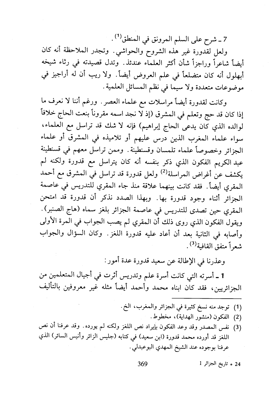 وكانت لقدورة أيضا مراسلات مع علماء العصر. ورغم أننا لا نعرف ما إذا كان قد حج وتعلم في المشرق (إذ لا نجد اسمه مقرونا بنعت الحاج خلافا لوالده الذي كان يدعى الحاج إبراهيم) فإنه لا شك قد تراسل مع العلماء، سواء علماء المغرب الذين درس عليهم أو تلاميذه في المشرق أو علماء الجزائر وخصوصا علماء تلمسان وقسنطينة. وممن تراسل معهم في قسنطينة عبد الكريم الفكون الذي ذكر بنفسه أنه كان يتراسل مع قدورة ولكنه لم يكشف عن أغراض المراسلة (¬2) ولعل قدورة قد تراسل في المشرق مع أحمد المقري أيضا. فقد كانت بينهما علاقة منذ جاء المقري للتدريس في عاصمة الجزائر أثناء وجود قدورة بها. وبهذا الصدد نذكر أن قدورة قد امتحن المقري حين تصدى للتدريس في عاصمة الجزائر بلغز سماه (هاج الصنبر). ويقول الفكون الذي روى ذلك أن المقري لم يصب الجواب في المرة الأولى وأصابه في الثانية بعد أن أعاد عليه قدورة اللغز. وكان السؤال والجواب شعرا متفق القافية (¬3).