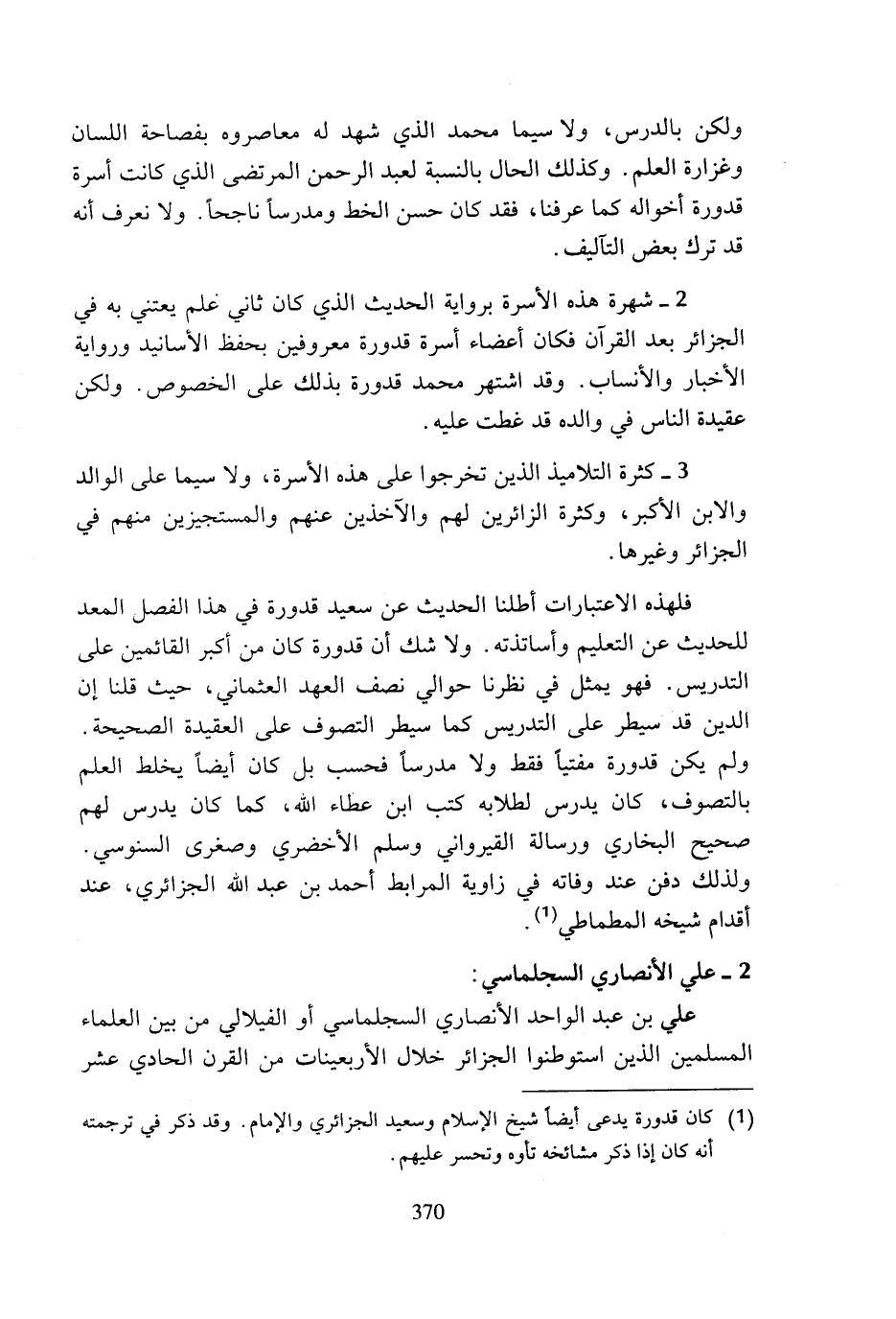 (¬1) كان قدورة يدعى أيضا شيخ الإسلام وسعيد الجزائري والإمام. وقد ذكر في ترجمته أنه كان إذا ذكر مشائخه تأوه وتحسر عليهم.