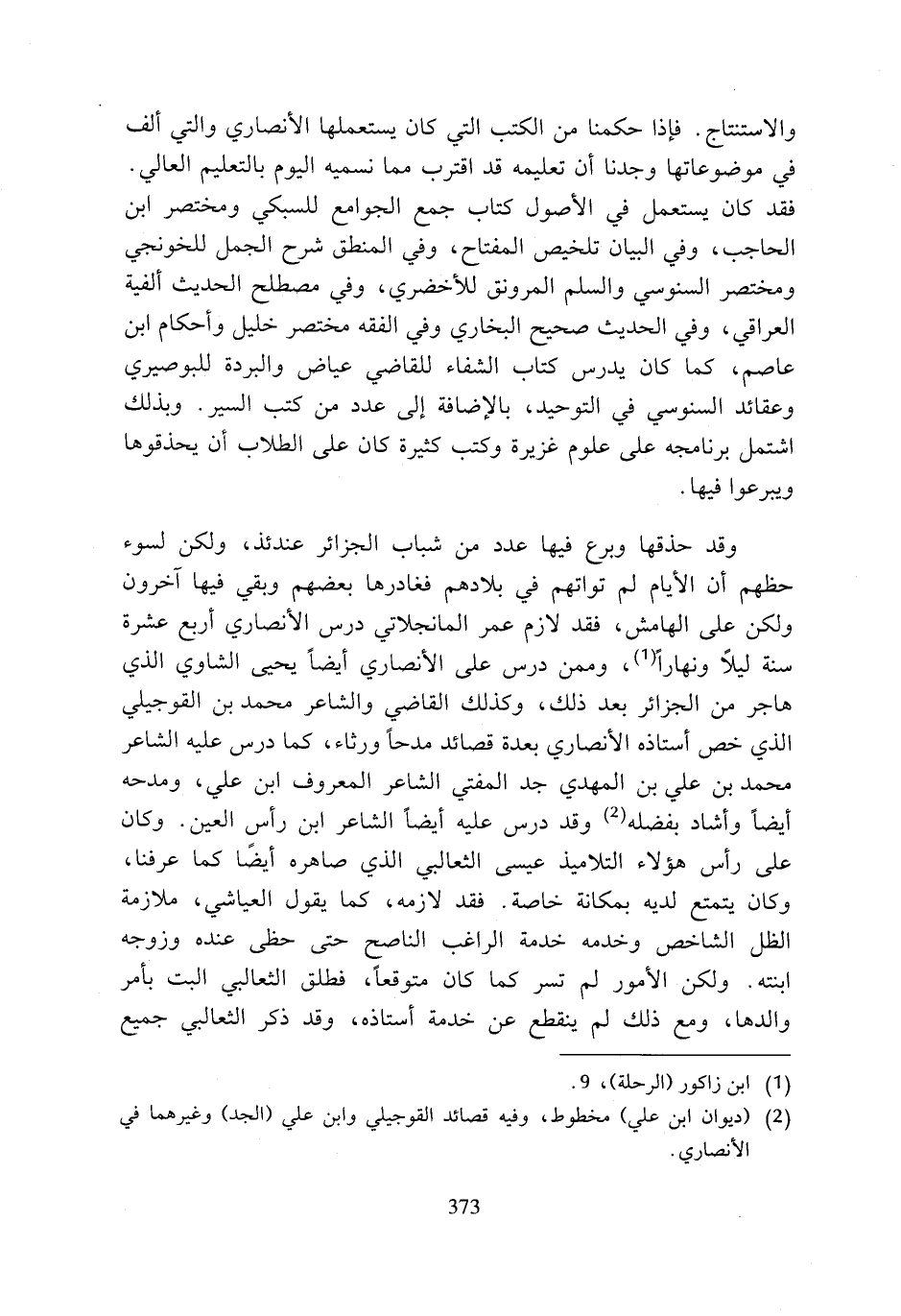 والاستنتاج. فإذا حكمنا من الكتب التي كان يستعملها الأنصاري والتي ألف في موضوعاتها وجدنا أن تعليمه قد اقترب مما نسميه اليوم بالتعليم العالي. فقد كان يستعمل في الأصول كتاب جمع الجوامع للسبكي ومختصر ابن الحاجب، وفي البيان تلخيص المفتاح، وفي المنطق شرح الجمل للخونجي ومختصر السنوسي والسلم المرونق للأخضري، وفي مصطلح الحديث ألفية العراقي، وفي الحديث صحيح البخاري وفي الفقه مختصر خليل وأحكام ابن عاصم، كما كان يدرس كتاب الشفاء للقاضي عياض والبردة للبوصيري وعقائد السنوسي في التوحيد، بالإضافة إلى عدد من كتب السير. وبذلك اشتمل برنامجه على علوم غزيرة وكتب كثيرة كان على الطلاب أن يحذقوها ويبرعوا فيها.