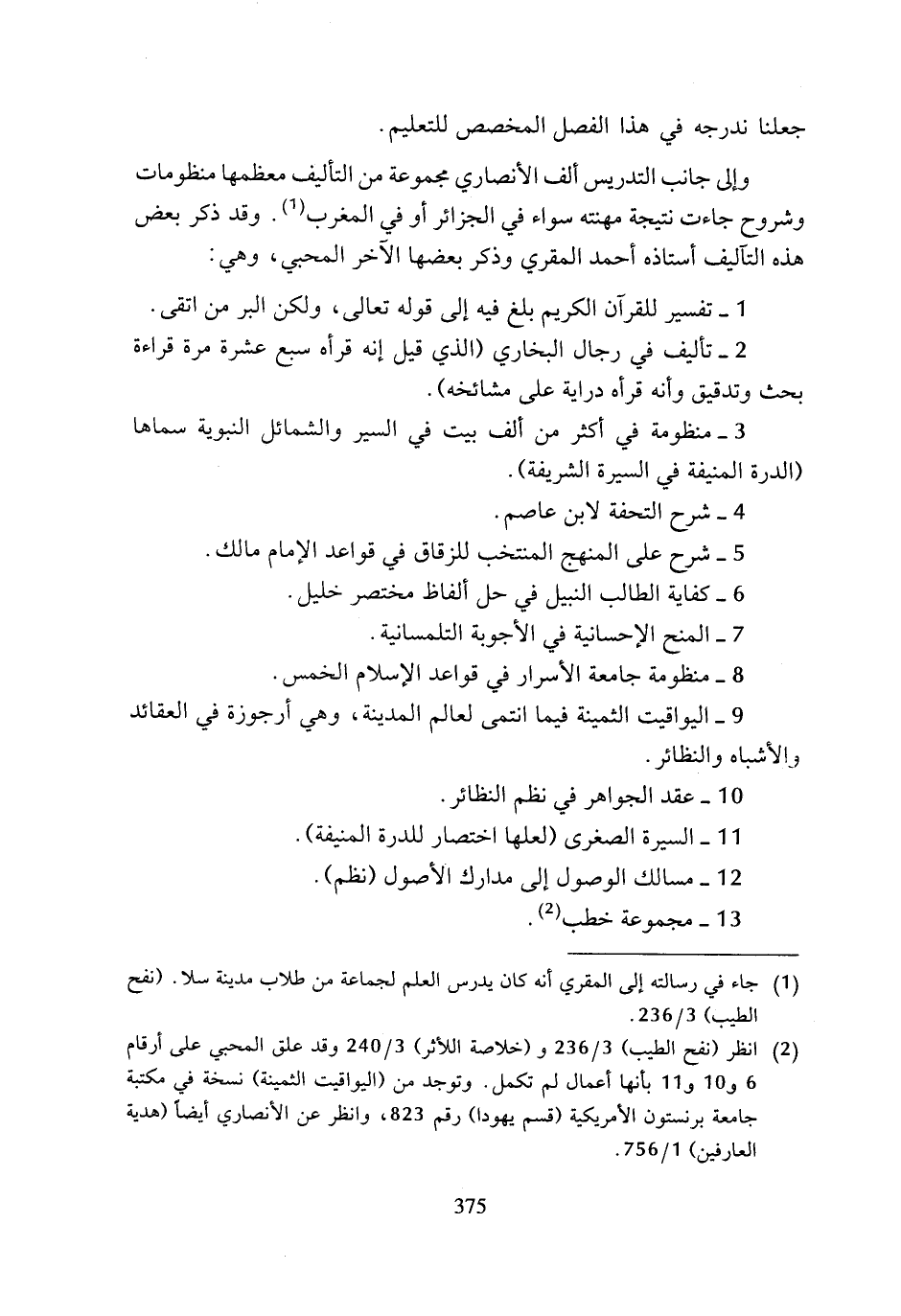 (¬2) انظر (نفح الطيب) 3/ 236 و (خلاصة الأثر) 3/ 240 وقد علق المحبي على أرقام 6 و 10 و 11 بأنها أعمال لم تكمل. وتوجد من (اليواقيت الثمينة) نسخة في مكتبة جامعة برنستون الأمريكية (قسم يهودا) رقم 823، وانظر عن الأنصاري أيضا (هدية العارفين) 1/ 756.
