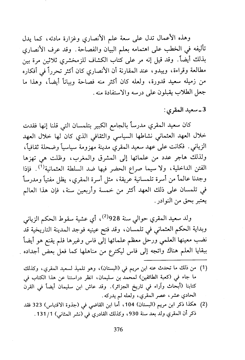 (¬1) من ذلك ما تحدث عنه ابن مريم في (البستان)، وهو تلميذ لسعيد المقري، وكذلك ما جاء في (كعبة الطائفين) لمحمد بن سليمان، انظر دراستنا عن هذا الكتاب في كتابنا (أبحاث وآراء في تاريخ الجزائر). وقد عاش ابن سليمان أيضا في القرن الحادي عشر، عصر المقري، ولعله لم يدركه.