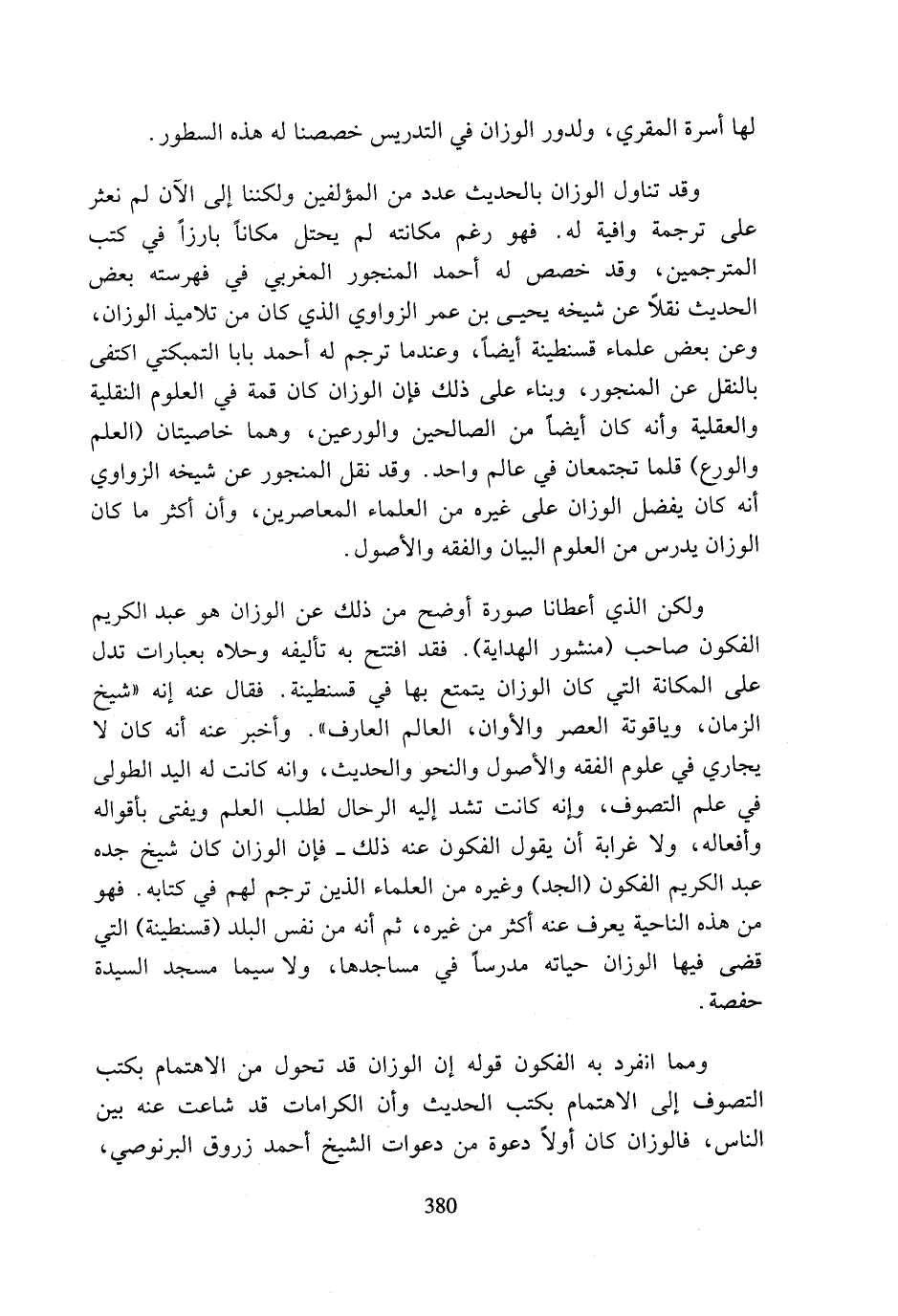 ولكن الذي أعطانا صورة أوضح من ذلك عن الوزان هو عبد الكريم الفكون صاحب (منشور الهداية). فقد افتتح به تأليفه وحلاه بعبارات تدل على المكانة التي كان الوزان يتمتع بها في قسنطينة. فقال عنه إنه (شيخ الزمان، وياقوتة العصر والأوان، العالم العارف). وأخبر عنه أنه كان لا يجاري في علوم الفقه والأصول والنحو والحديث، وانه كانت له اليد الطولى في علم التصوف، وإنه كانت تشد إليه الرحال لطلب العلم ويفتى بأقواله وأفعاله، ولا غرابة أن يقول الفكون عنه ذلك - فإن الوزان كان شيخ جده عبد الكريم الفكون (الجد) وغيره من العلماء الذين ترجم لهم في كتابه. فهو من هذه الناحية يعرف عنه أكثر من غيره، ثم أنه من نفس البلد (قسنطينة) التي قضى فيها الوزان حياته مدرسا في مساجدها، ولا سيما مسجد السيدة حفصة.