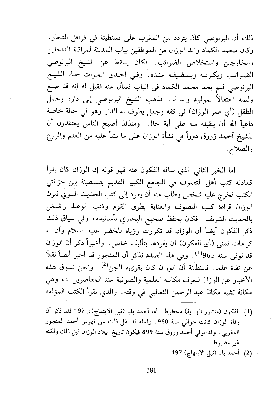 أما الخبر الثاني الذي ساقه الفكون عنه فهو قوله إن الوزان كان يقرأ كعادته كتب أهل التصوف في الجامع الكبير القديم بقسنطينة بين خزانتي الكتب فخرج عليه شخص وطلب منه أن يعود إلى كتب الحديث النبوي فترك الوزان قراءة كتب التصوف والعناية بطرق القوم وكتب الوعظ واشتغل بالحديث الشريف. فكان يحفظ صحيح البخاري بأسانيده، وفي سياق ذلك ذكر الفكون أيضا أن الوزان قد تكررت رؤياه للخضر عليه السلام وأن له كرامات تمنى (أي الفكون) أن يفردها بتأليف خاص. وأخيرا ذكر أن الوزان قد توفي سنة 965 (¬1). وفي هذا الصدد نذكر أن المنجور قد أخبر أيضا نقلا عن ثقاة علماء قسنطينة أن الوزان كان يقريء الجن (¬2). ونحن نسوق هذه الأخبار عن الوزان لنعرف مكانته العلمية والصوفية عند المعاصرين له، وهي مكانة تشبه مكانة عبد الرحمن الثعالبي في وقته. والذي يقرأ الكتب المؤلفة