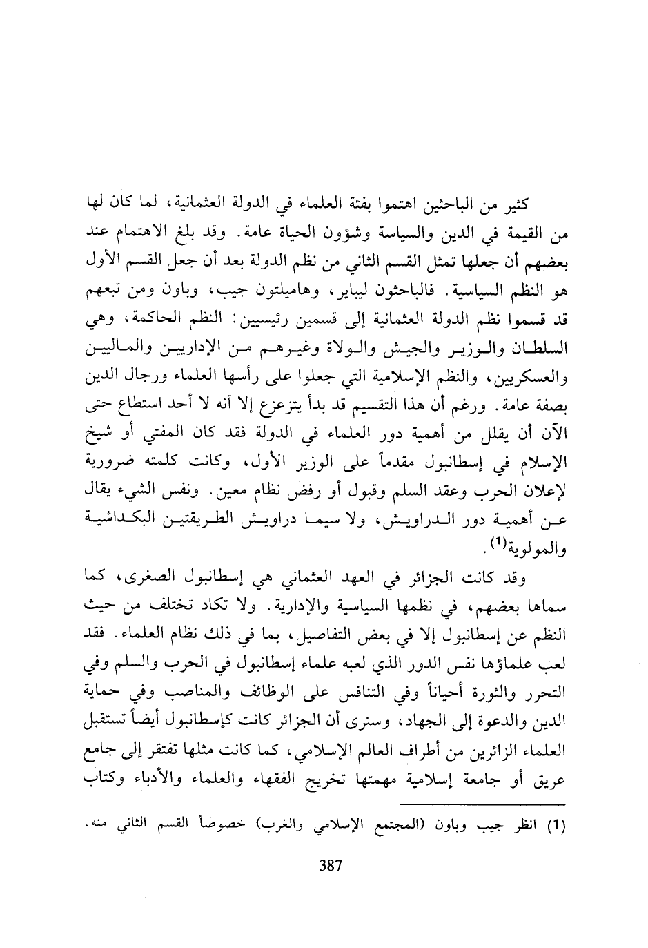 كثير من الباحثين اهتموا بفئة العلماء في الدولة العثمانية، لما كان لها من القيمة في الدين والسياسة وشؤون الحياة عامة. وقد بلغ الاهتمام عند بعضهم أن جعلها تمثل القسم الثاني من نظم الدولة بعد أن جعل القسم الأول هو النظم السياسية. فالباحثون ليباير، وهاميلتون جيب، وباون ومن تبعهم قد قسموا نظم الدولة العثمانية إلى قسمين رئيسيين. النظم الحاكمة، وهي السلطان والوزير والجيش والولاة وغيرهم من الإداريين والماليين والعسكريين، والنظم الإسلامية التي جعلوا على رأسها العلماء ورجال الدين بصفة عامة. ورغم أن هذا التقسيم قد بدأ يتزعزع إلا أنه لا أحد استطاع حتى الآن أن يقلل من أهمية دور العلماء في الدولة فقد كان المفتي أو شيخ الإسلام في إسطانبول مقدما على الوزير الأول، وكانت كلمته ضرورية لإعلان الحرب وعقد السلم وقبول أو رفض نظام معين. ونفس الشيء يقال عن أهمية دور الدراويش، ولا سيما دراويش الطريقتين البكداشية والمولوية (¬1).