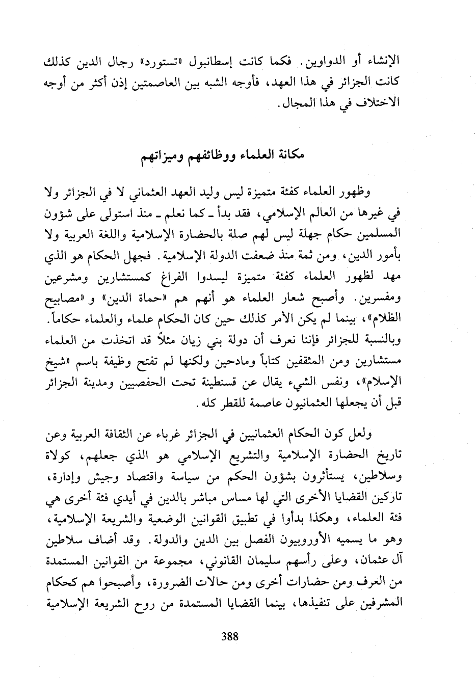 وظهور العلماء كفئة متميزة ليس وليد العهد العثماني لا في الجزائر ولا في غيرها من العالم الإسلامي، فقد بدأ - كما نعلم - منذ استولى على شؤون المسلمين حكام جهلة ليس لهم صلة بالحضارة الإسلامية واللغة العربية ولا بأمور الدين، ومن ثمة منذ ضعفت الدولة الإسلامية. فجهل الحكام هو الذي مهد لظهور العلماء كفئة متميزة ليسدوا الفراغ كمستشارين ومشرعين ومفسرين. وأصبح شعار العلماء هو أنهم هم (حماة الدين) و (مصابيح الظلام)، بينما لم يكن الأمر كذلك حين كان الحكام علماء والعلماء حكاما. وبالنسبة للجزائر فإننا نعرف أن دولة بني زيان مثلا قد اتخذت من العلماء مستشارين ومن المثقفين كتابا ومادحين ولكنها لم تفتح وظيفة باسم (شيخ الإسلام)، ونفس الشيء يقال عن قسنطينة تحت الحفصيين ومدينة الجزائر قبل أن يجعلها العثمانيون عاصمة للقطر كله.
