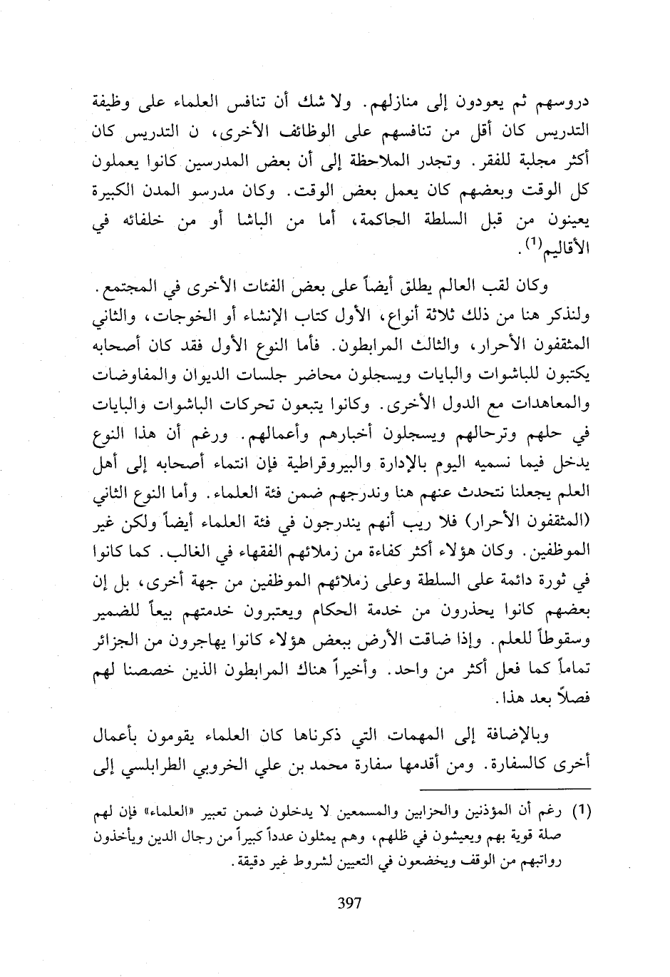 (¬1) رغم أن المؤذنين والحزابين والمسمعين لا يدخلون ضمن تعبير (العلماء) فإن لهم صلة قوية بهم ويعيشون في ظلهم، وهم يمثلون عددا كبيرا من رجال الدين ويأخذون رواتبهم من الوقف ويخضعون في التعيين لشروط غير دقيقة.