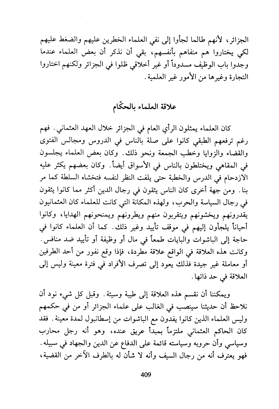 ويمكننا أن نقسم هذه العلاقة إلى طيبة وسيئة. وقبل كل شيء نود أن نلاحظ أن حديثنا سينصب في الغالب على علماء الجزائر أو من في حكمهم وليس العلماء الذين كانوا يفدون مع الباشوات من إسطانبول لمدة معينة. فقد كان الحاكم العثماني ملتزما بمبدأ عريق عنده، وهو أنه رجل محارب وسياسي وأن حروبه وسياسته قائمة على الدفاع عن الدين والجهاد في سبيله. فهو يعترف أنه من رجال السيف وأنه لا شأن له بالطرف الآخر من القضية،