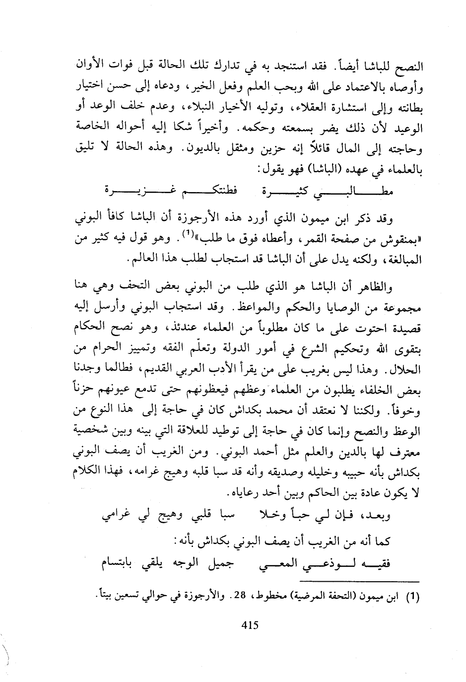 وقد ذكر ابن ميمون الذي أورد هذه الأرجوزة أن الباشا كافأ البوني (بمنقوش من صفحة القمر، وأعطاه فوق ما طلب) (¬1). وهو قول فيه كثير من المبالغة، ولكنه يدل على أن الباشا قد استجاب لطلب هذا العالم.