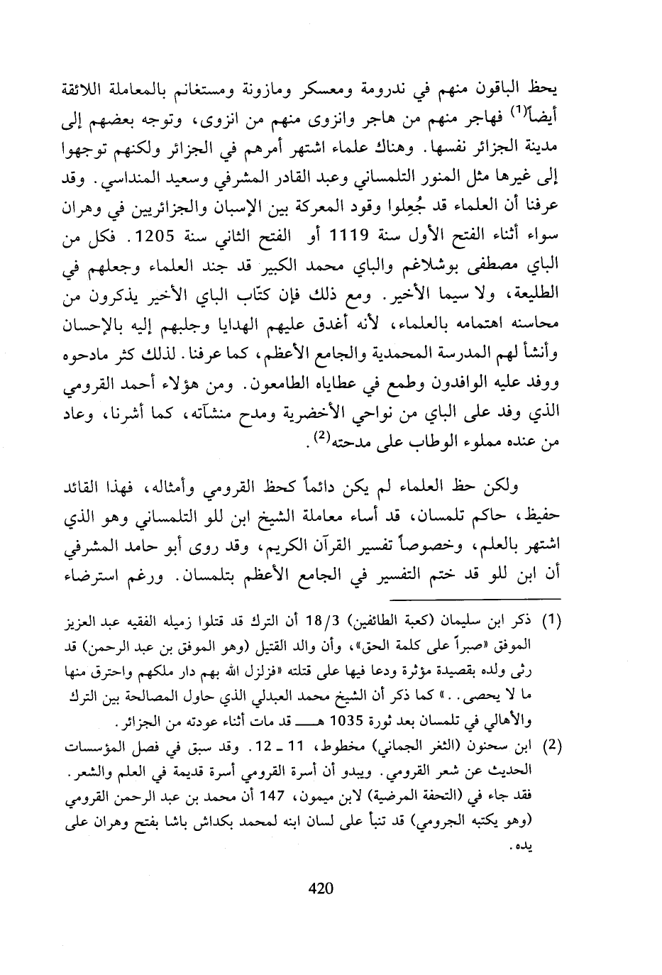 (¬2) ابن سحنون (الثغر الجماني) مخطوط، 11 - 12. وقد سبق في فصل المؤسسات الحديث عن شعر القرومي. ويبدو أن أسرة القرومي أسرة قديمة في العلم والشعر. فقد جاء في (التحفة المرضية) لابن ميمون، 147 أن محمد بن عبد الرحمن القرومي (وهو يكتبه الجرومي) قد تنبأ على لسان ابنه لمحمد بكداش باشا بفتح وهران على يده.