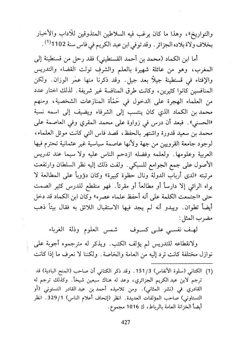 (¬1) الكتاني (سلوة الأنفاس) 3/ 151. وقد ذكر الكتاني أن صاحب (المنح البادية) قد ترجم لابن عبد الكريم الجزائري، وعد له هناك سبعين شيخا. وكذلك ترجم له القادري في (نشر المثاني) , ومن تلاميذه أحمد بن عبد القادر التستوني (أو التستاوني) صاحب المؤلفات العديدة. انظر (إتحاف أعلام الناس) 1/ 329. انظر أيضا الخزانة العامة بالرباط، ك 1016 مجموع.