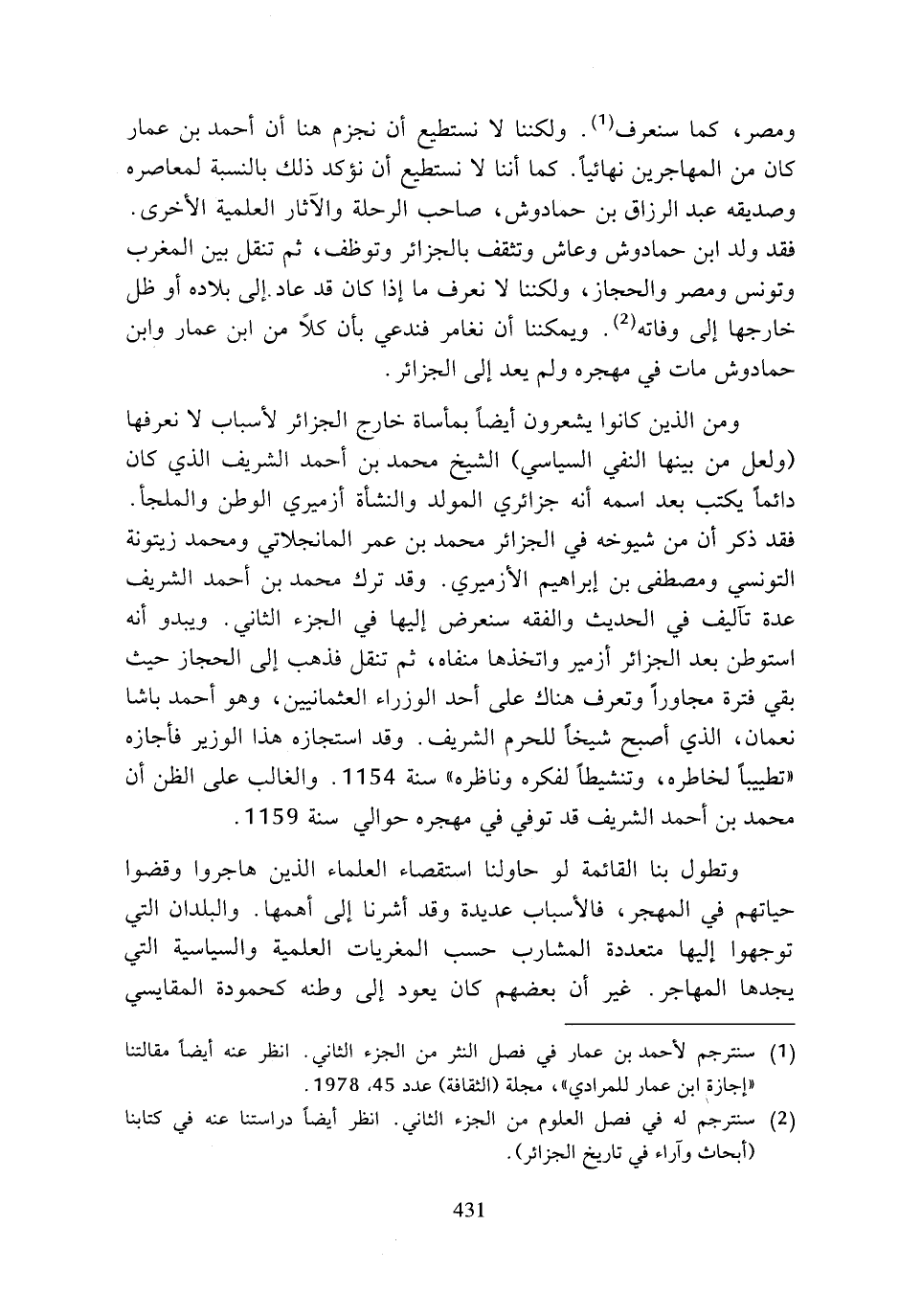 ومصر، كما سنعرف (¬1). ولكننا لا نستطيع أن نجزم هنا أن أحمد بن عمار كان من المهاجرين نهائيا. كما أننا لا نستطيع أن نؤكد ذلك بالنسبة لمعاصره وصديقه عبد الرزاق بن حمادوش، صاحب الرحلة والآثار العلمية الأخرى. فقد ولد ابن حمادوش وعاش وتثقف بالجزائر وتوظف، ثم تنقل بين المغرب وتونس ومصر والحجاز، ولكننا لا نعرف ما إذا كان قد عاد إلى بلاده أو ظل خارجها إلى وفاته (¬2). ويمكننا أن نغامر فندعي بأن كلا من ابن عمار وابن حمادوش مات في مهجره ولم يعد إلى الجزائر.