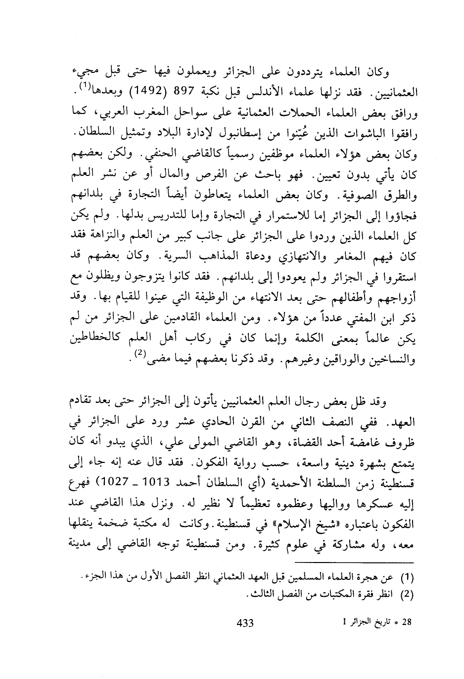 وكان العلماء يترددون على الجزائر ويعملون فيها حتى قبل مجيء العثمانيين. فقد نزلها علماء الأندلس قبل نكبة 897 (1492) وبعدها (¬1). ورافق بعض العلماء الحملات العثمانية على سواحل المغرب العربي، كما رافقوا الباشوات الذين عينوا من إسطانبول لإدارة البلاد وتمثيل السلطان. وكان بعض هؤلاء العلماء موظفين رسميا كالقاضي الحنفي. ولكن بعضهم كان يأتي بدون تعيين. فهو باحث عن الفرص والمال أو عن نشر العلم والطرق الصوفية. وكان بعض العلماء يتعاطون أيضا التجارة في بلدانهم فجاؤوا إلى الجزائر إما للاستمرار في التجارة وإما للتدريس بدلها. ولم يكن كل العلماء الذين وردوا على الجزائر على جانب كبير من العلم والنزاهة فقد كان فيهم المغامر والانتهازي ودعاة المذاهب السرية. وكان بعضهم قد استقروا في الجزائر ولم يعودوا إلى بلدانهم. فقد كانوا يتزوجون ويظلون مع أزواجهم وأطفالهم حتى بعد الانتهاء من الوظيفة التي عينوا للقيام بها - وقد ذكر ابن المفتي عددا من هؤلاء. ومن العلماء القادمين على الجزائر من لم يكن عالما بمعنى الكلمة وإنما كان في ركاب أهل العلم كالخطاطين والنساخين والوراقين وغيرهم. وقد ذكرنا بعضهم فيما مضى (¬2).