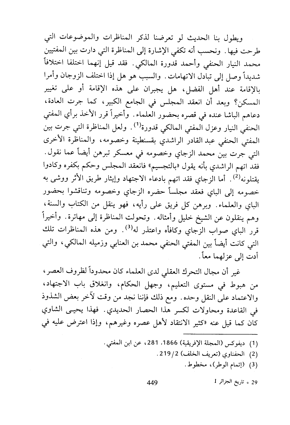 ويطول بنا الحديث لو تعرضنا لذكر المناظرات والموضوعات التي طرحت فيها. ونحسب أنه تكفي الإشارة إلى المناظرة التي دارت بين المفتيين محمد النيار الحنفي وأحمد قدورة المالكي. فقد قيل إنهما اختلفا اختلافا شديدا وصل إلى تبادل الاتهامات. والسبب هو هل إذا اختلف الزوجان وأمرا بالإقامة عند أهل الفضل، هل يجبران على هذه الإقامة أو على تغيير المسكن؟ وبعد أن انعقد المجلس في الجامع الكبير، كما جرت العادة، دعاهم الباشا عنده في قصره بحضور العلماء. وأخيرا قرر الأخذ برأي المفتي الحنفي النيار وعزل المفتي المالكي قدورة (¬1). ولعل المناظرة التي جرت بين المفتي الحنفي عبد القادر الراشدي بقسنطينة وخصومه، والمناظرة الأخرى التي جرت بين محمد الزجاي وخصومه في معسكر تبرهن أيضا عما نقول. فقد اتهم الراشدي بأنه يقول (بالتجسيم) فانعقد المجلس وحكم بكفره وكادوا يقتلونه (¬2). أما الزجاي فقد اتهم بادعاء الاجتهاد وإيثار طريق الأثر ووشى به خصومه إلى الباي فعقد مجلسا حضره الزجاي وخصومه وتناقشوا بحضور الباي والعلماء. وبرهن كل فريق على رأيه، فهو ينقل من الكتاب والسنة، وهم ينقلون عن الشيخ خليل وأمثاله. وتحولت المناظرة إلى مهاترة. وأخيرا قرر الباي صواب الزجاي وكافأه واعتذر له (¬3). ومن هذه المناظرات تلك التي كانت أيضا بين المفتي الحنفي محمد بن العنابي وزميله المالكي، والتي أدت إلى عزلهما معا.