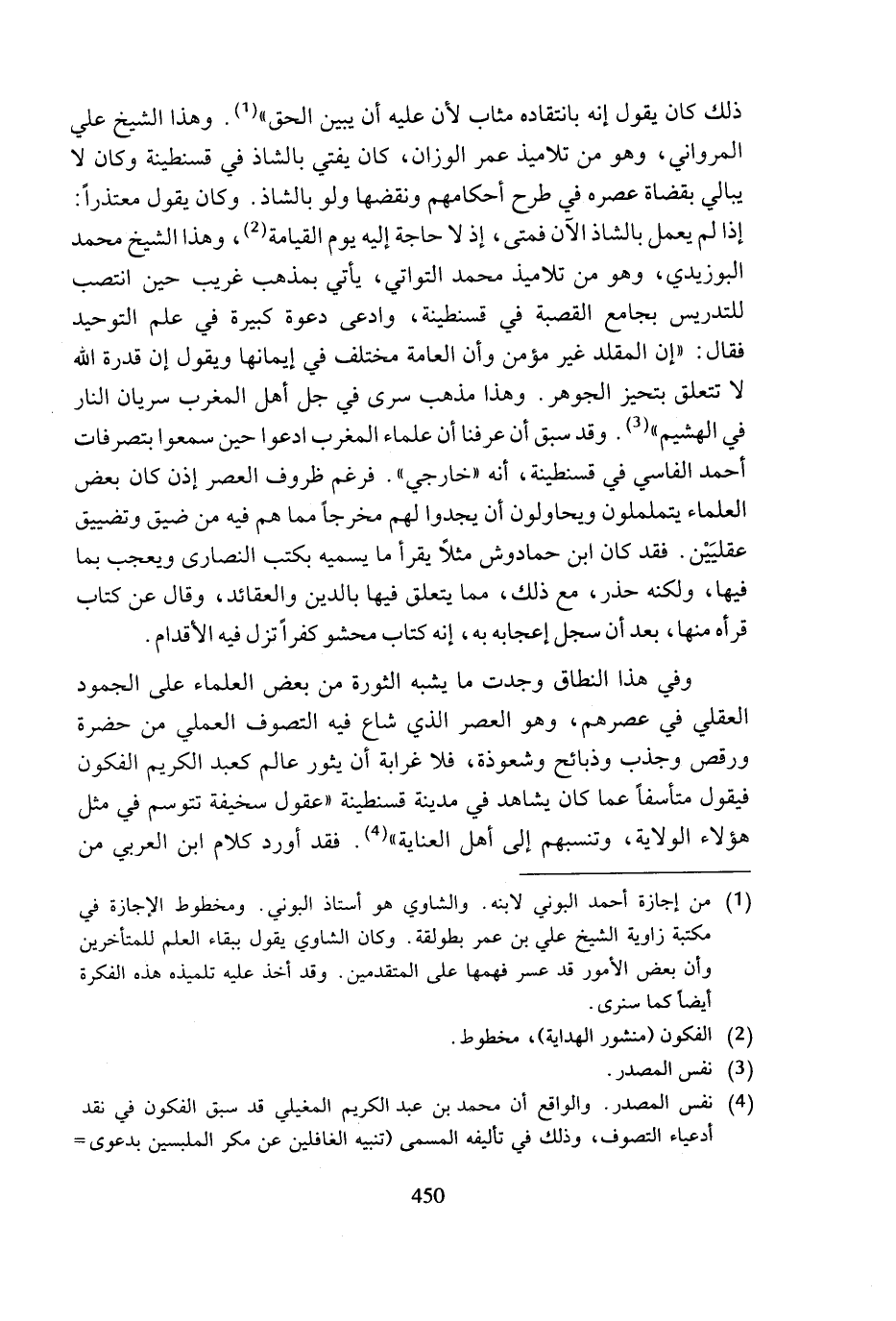 (¬4) نفس المصدر. والواقع أن محمد بن عبد الكريم المغيلي قد سبق الفكون في نقد أدعياء التصوف، وذلك في تأليفه المسمى (تنبيه الغافلين عن مكر الملبسين بدعوى =