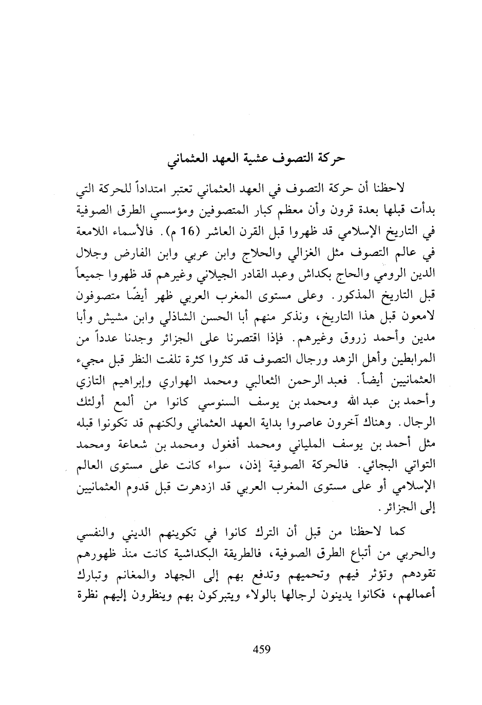 لاحظنا أن حركة التصوف في العهد العثماني تعتبر امتدادا للحركة التي بدأت قبلها بعدة قرون وأن معظم كبار المتصوفين ومؤسسي الطرق الصوفية في التاريخ الإسلامي قد ظهروا قبل القرن العاشر (16 م). فالأسماء اللامعة في عالم التصوف مثل الغزالي والحلاج وابن عربي وابن الفارض وجلال الدين الرومي والحاج بكداش وعبد القادر الجيلاني وغيرهم قد ظهروا جميعا قبل التاريخ المذكور. وعلى مستوى المغرب العربي ظهر أيضا متصوفون لامعون قبل هذا التاريخ، ونذكر منهم أبا الحسن الشاذلي وابن مشيش وأبا مدين وأحمد زروق وغيرهم. فإذا اقتصرنا على الجزائر وجدنا عددا من المرابطين وأهل الزهد ورجال التصوف قد كثروا كثرة تلفت النظر قبل مجيء العثمانيين أيضا. فعبد الرحمن الثعالبي ومحمد الهواري وإبراهيم التازي وأحمد بن عبد الله ومحمد بن يوسف السنوسي كانوا من ألمع أولئك الرجال. وهناك آاخرون عاصروا بداية العهد العثماني ولكنهم قد تكونوا قبله مثل أحمد بن يوسف الملياني ومحمد أفغول ومحمد بن شعاعة ومحمد التواتي البجائي. فالحركة الصوفية إذن، سواء كانت على مستوى العالم الإسلامي أو على مستوى المغرب العربي قد ازدهرت قبل قدوم العثمانيين إلى الجزائر.