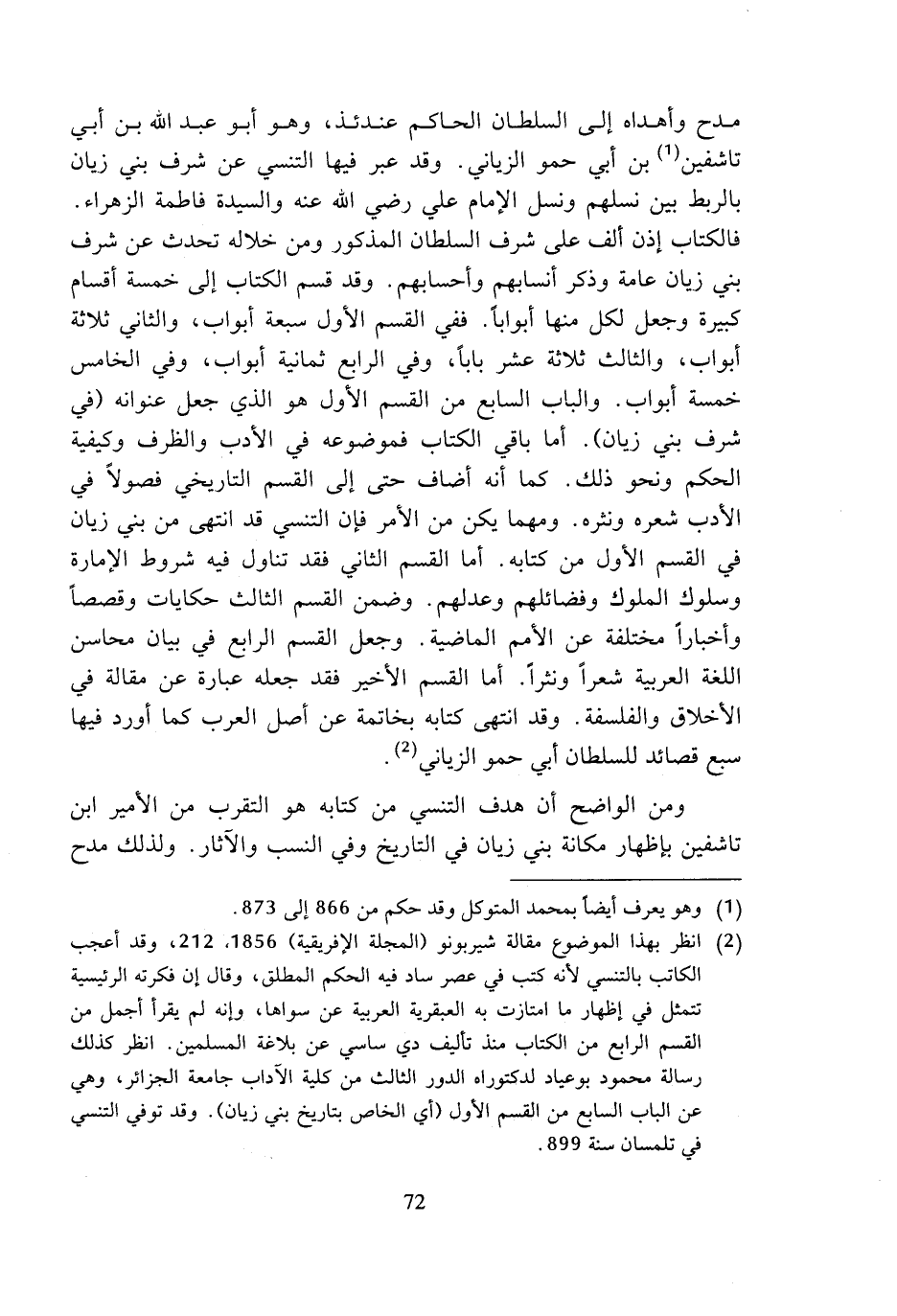 (¬2) انظر بهذا الموضوع مقالة شيربونو (المجلة الإفريقية) 1856، 212، وقد أعجب الكاتب بالتنسي لأنه كتب في عصر ساد فيه الحكم المطلق، وقال إن فكرته الرئيسية تتمثل في إظهار ما امتازت به العبقرية العربية عن سواها، وإنه لم يقرأ أجمل من القسم الرابع من الكتاب منذ تأليف دي ساسي عن بلاغة المسلمين. انظر كذلك رسالة محمود بوعياد لدكتوراه الدور الثالث من كلية الآداب جامعة الجزائر، وهي عن الباب السابع من القسم الأول (أي الخاص بتاريخ بني زيان). وقد توفي التنسي في تلمسان سنة 899.