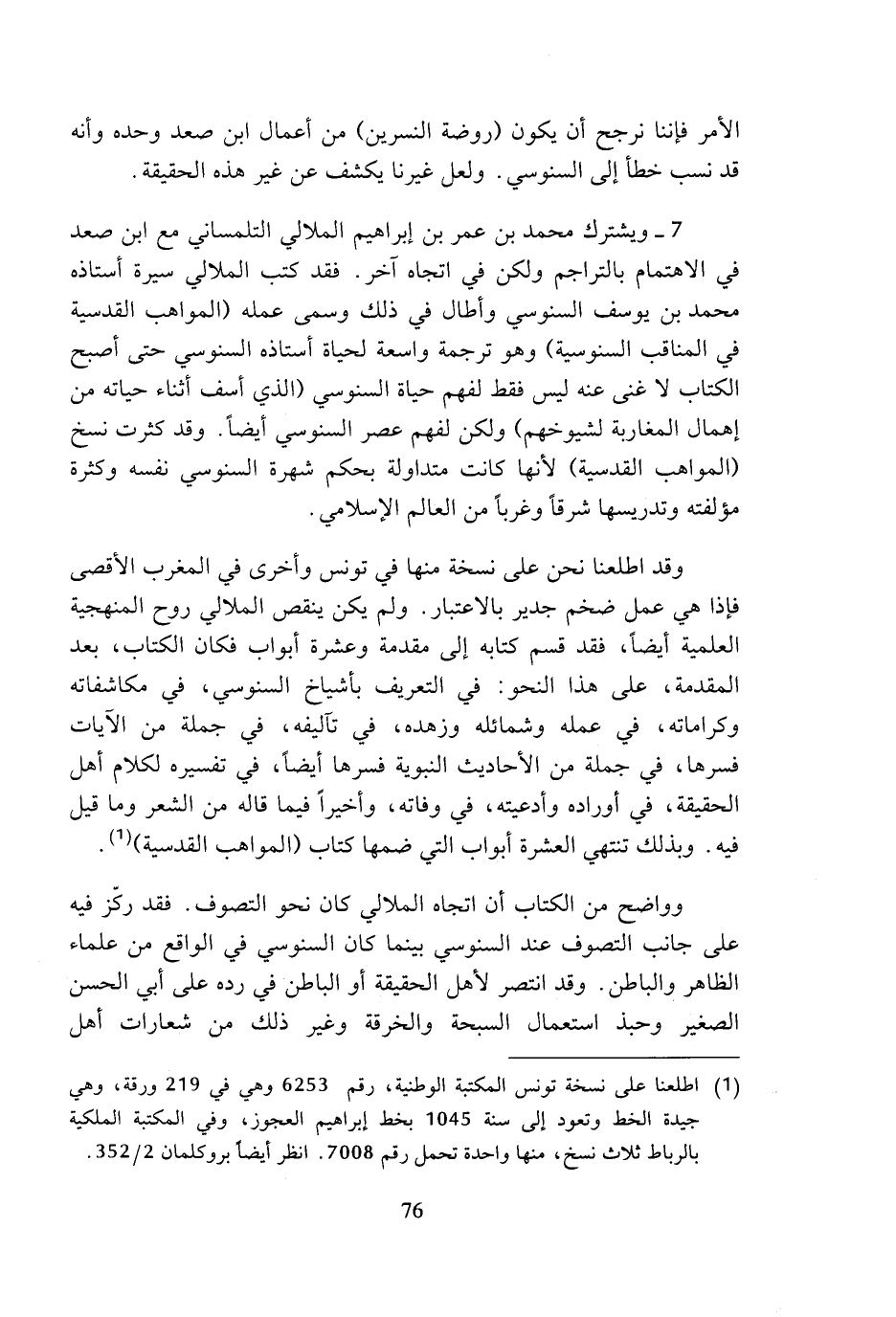(¬1) اطلعنا على نسخة تونس المكتبة الوطنية، رقم 6253 وهي في 219 ورقة، وهي جيدة الخط وتعود إلى سنة 1045 بخط إبراهيم العجوز، وفي المكتبة الملكية بالرباط ثلاث نسخ، منها واحدة تحمل رقم 7008. انظر أيضا بروكلمان 2/ 352.