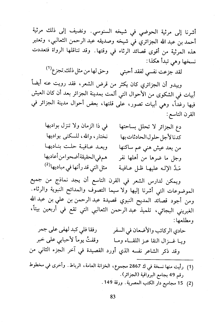 أشرنا إلى مرثية الحوضي في شيخه السنوسي. ونضيف إلى ذلك مرثية أحمد بن عبد الله الجزائري في شيخه وصديقه عبد الرحمن الثعالبي، وتعتبر هذه المرثية من أقوى قصائد الرثاء في وقتها. وقد تناقلها الرواة فتعددت نسخها وهي تبدأ هكذا: