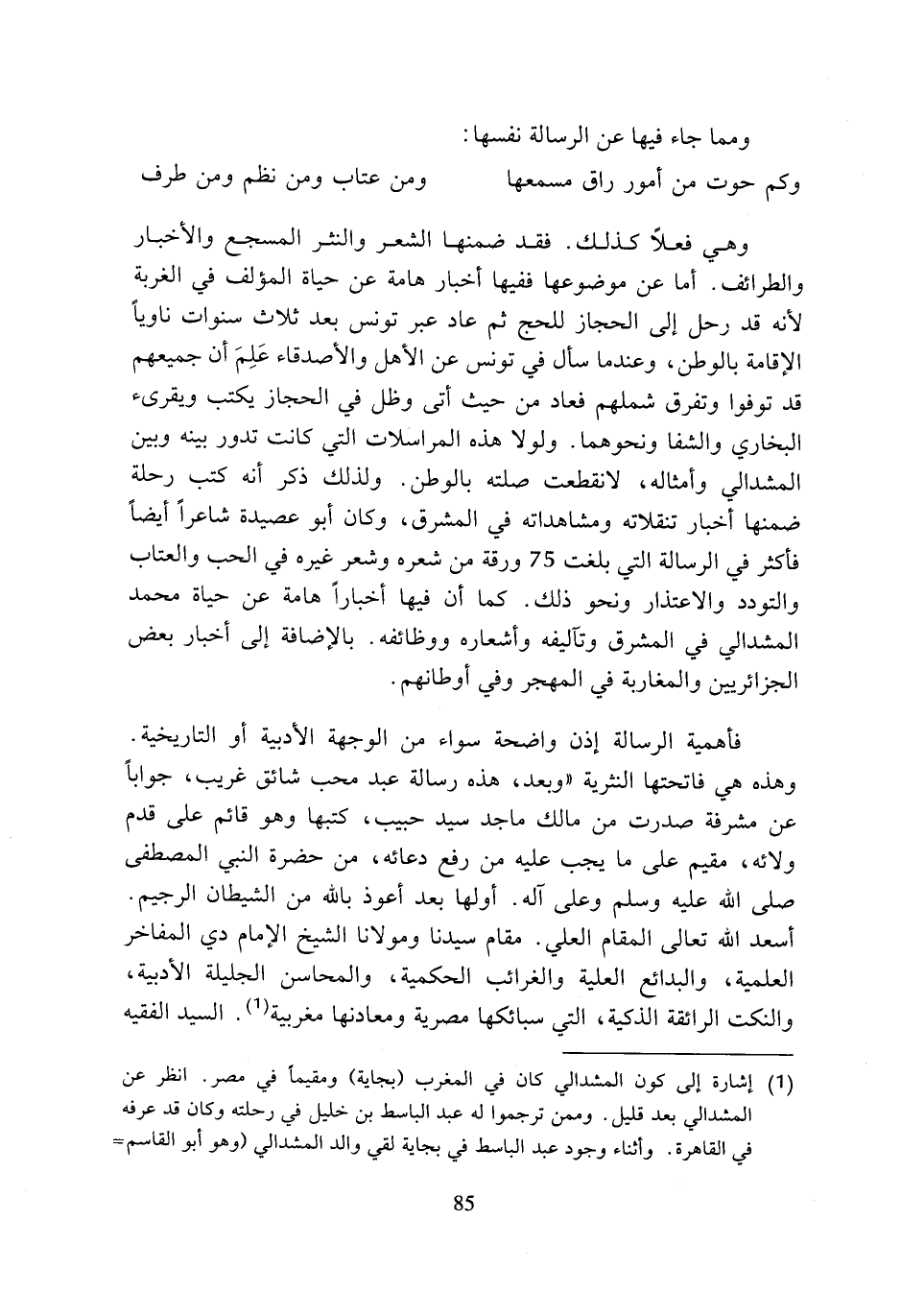 (¬1) إشارة إلى كون المشدالي كان في المغرب (بجاية) ومقيما في مصر. انظر عن المشدالي بعد قليل. وممن ترجموا له عبد الباسط بن خليل في رحلته وكان قد عرفه في القاهرة. وأثناء وجود عبد الباسط في بجاية لقي والد المشدالي (وهو أبو القاسم =